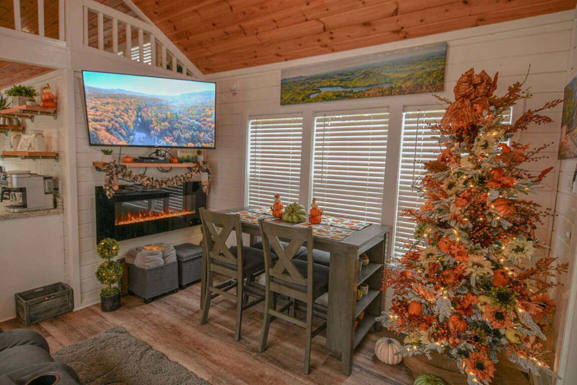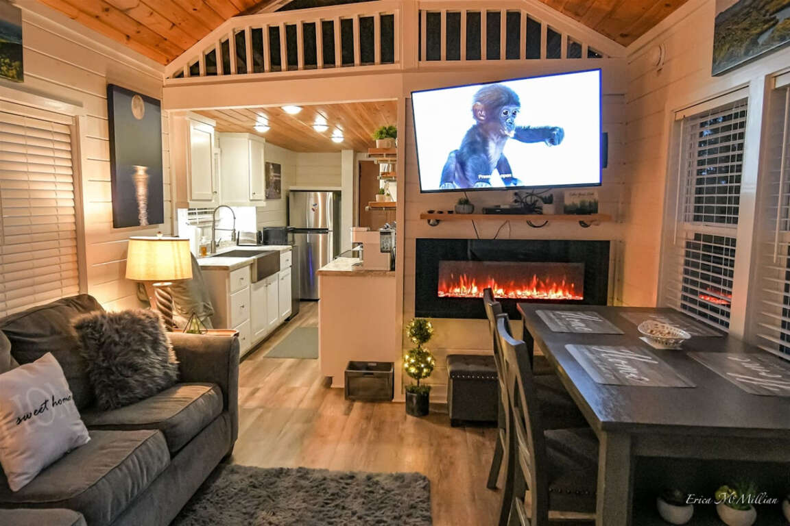After a day of adventure, cozy up on the sofa in front of the wall-mounted electric fireplace and enjoy your favorite shows on the 50" TV in the living room, equipped with Blu-ray, streaming capabilities, and cable TV.