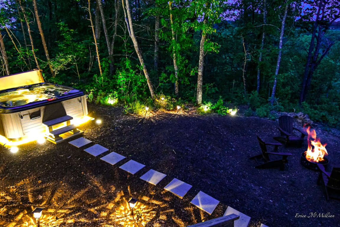To preserve the enchanting night sky, we kindly ask that you do not turn off the decorative tree lights, which are set on timers. Behind the cabin, only the hot tub base and solar lights are illuminated to allow for star-gazing.