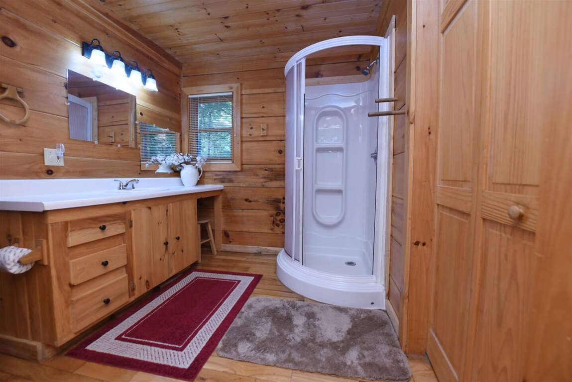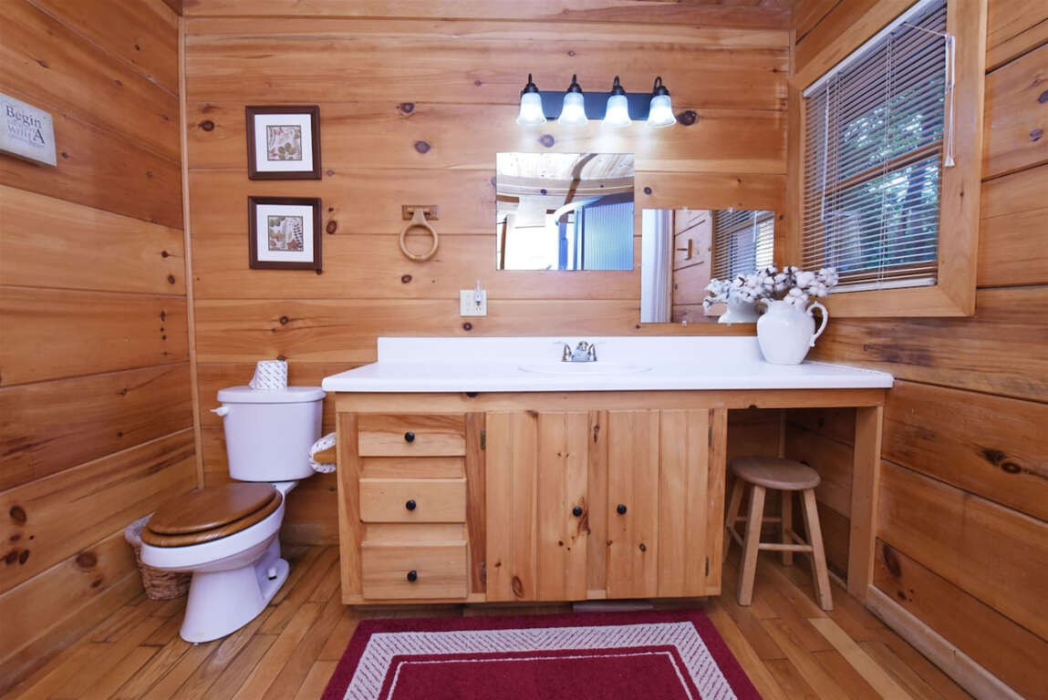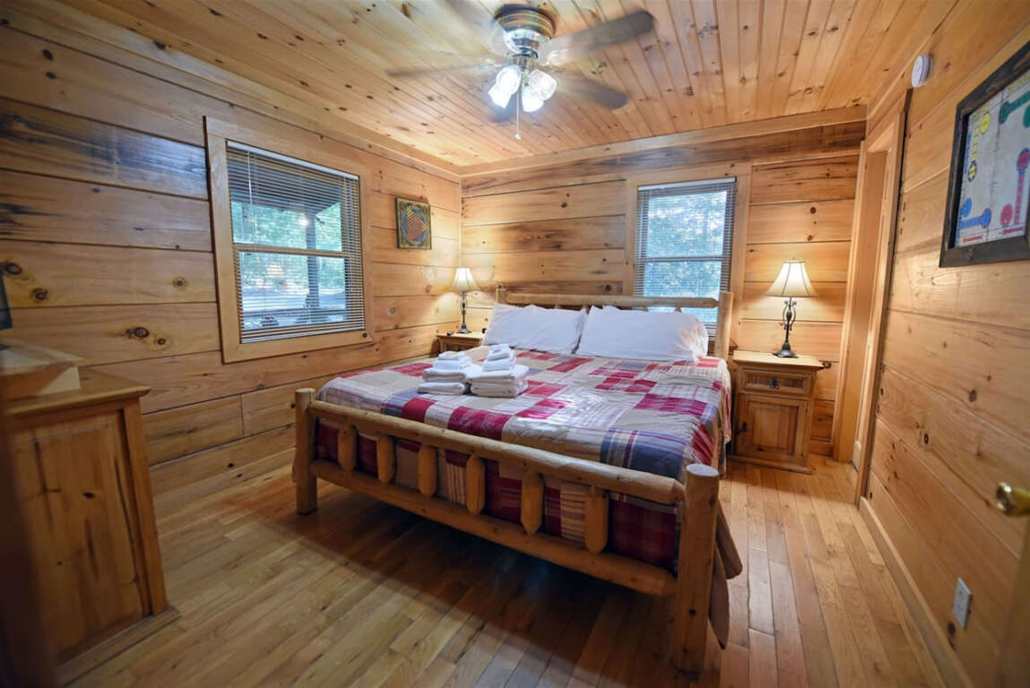 This one-level cabin provides a tranquil retreat for couples seeking a romantic getaway or families looking to unwind in peace. The main bedroom features a private walk-in shower, while the second bedroom boasts a king-size bed. Both rooms are beautifully decorated with wood-framed beds and stunning wood accents.