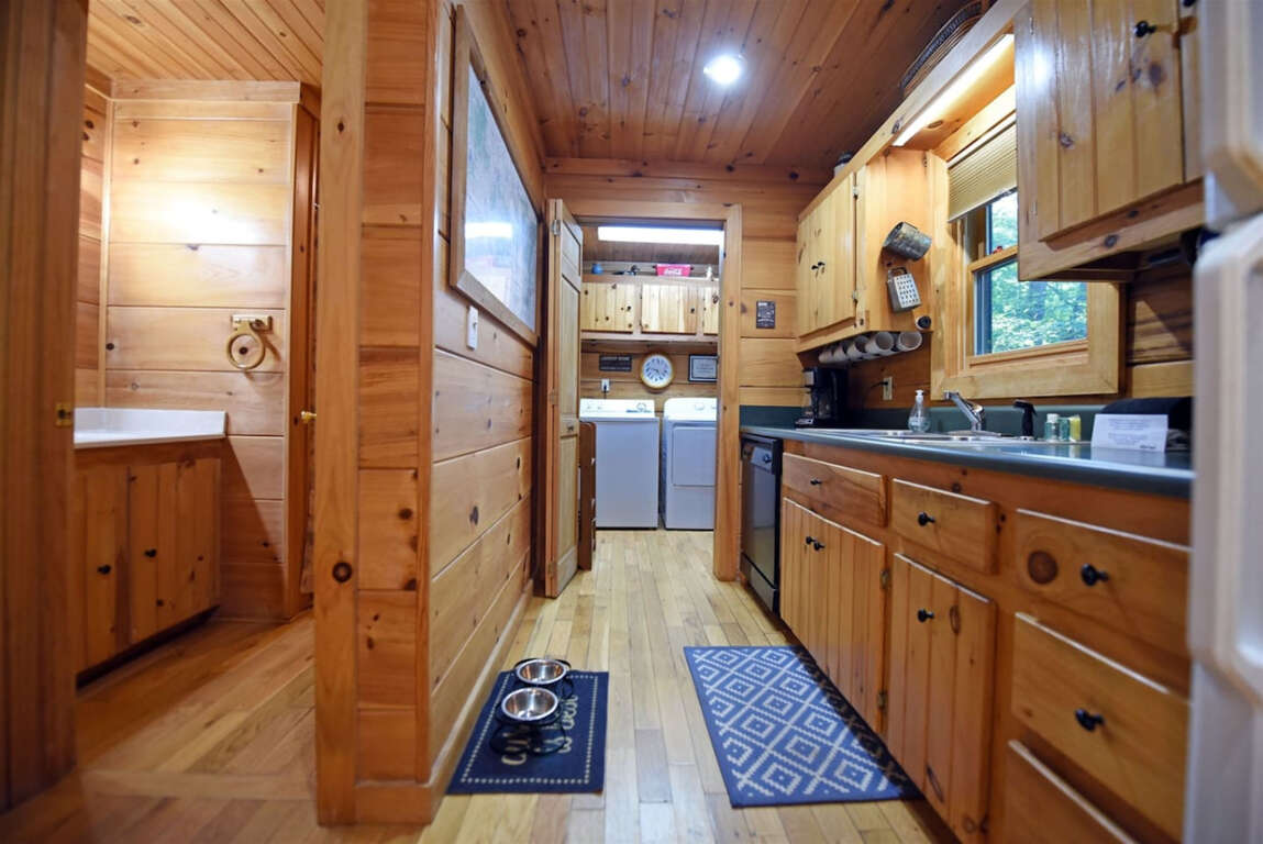 The kitchen is fully stocked and offers seating for six, while the living room is an ideal spot to relax by the wood-burning fireplace or to watch a movie. Spend your evenings around the fire pit, roasting marshmallows, singing campfire songs, or simply enjoying the sounds of nature.