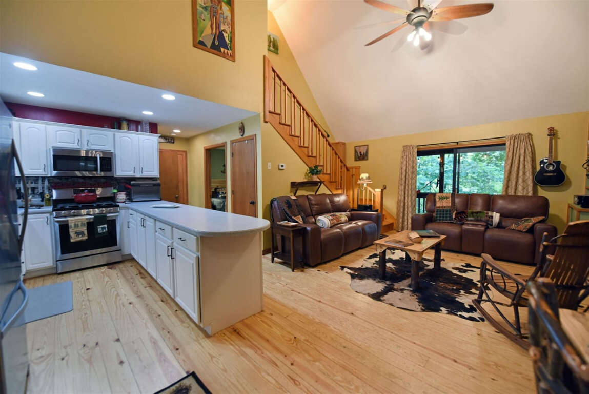 This cabin was wonderful! Kitchen fully stocked with anything needed to cook!(minus spices… but we picked those up). Comfy beds! Beautiful porch but was too cold for us to enjoy. Our dogs loved the doggie door to go outside!