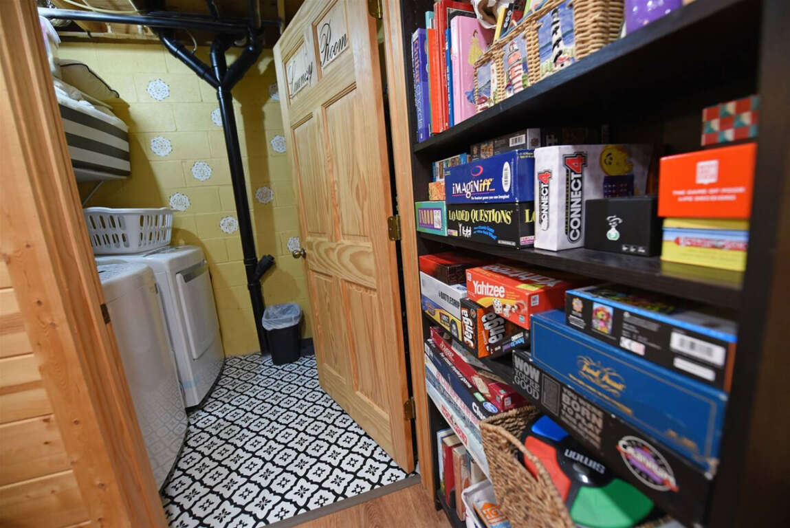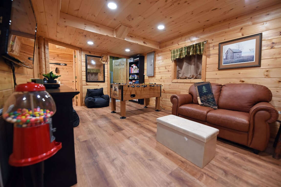 Head to the lower-level game room for fun and entertainment, featuring a foosball table and a variety of games to keep everyone engaged.