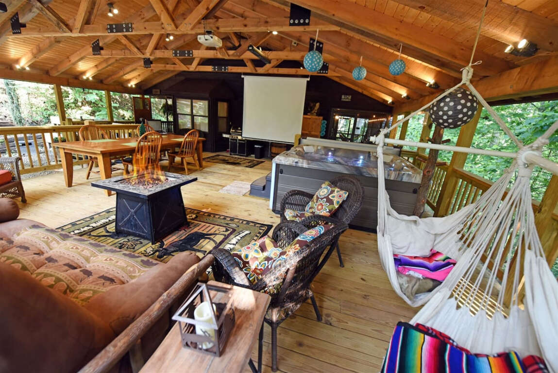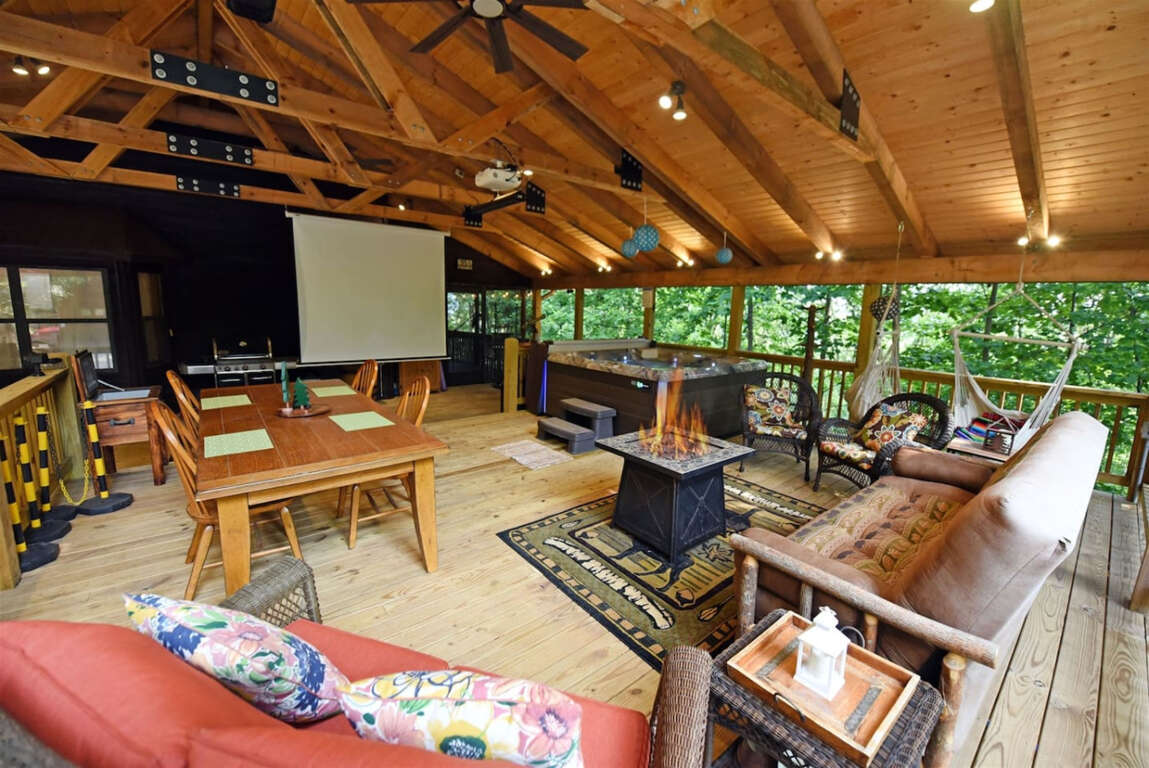Enjoy the breathtaking seasonal mountain views and refreshing summer shade, creating a tranquility ideal for your mountain escape. Step out onto the spacious covered deck and breathe in the crisp mountain air. Whether you're sipping morning coffee, practicing yoga, hosting a barbecue, gathering around the gas fire pit (available for an additional fee), relaxing in hammocks, or watching an outdoor movie, the deck is an ideal gathering place throughout the year. Equipped with infrared heaters and fans, your comfort is ensured during cozy winter evenings and warm summer days, enhanced by dimmable lighting to set the mood. Don't forget to check out the outdoor movie projector with Apple TV for a memorable cinematic experience. After an action-packed day, unwind in the 7-person hot tub for ultimate relaxation.