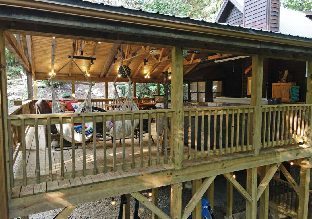We had such an amazing time here. The cabin layout was great with each couple having their own floor with the middle floor being used as the hangout area. Tons of privacy! We greatly enjoyed the covered deck as well! The outdoor projector screen, couches and hot tub were awesome! We had to brush off the couches and table daily due to pollen/dirt/sawdust from the carpenter bees, but that's to be expected on outdoor furniture. We were able to sit outside and watch the spring storms roll through. We ate several meals out there and it was great to let the pups run around when all the gates were closed. They were also able to use the dog run without having to get "suited up" to go for a walk. We took full advantage of the excursions offered as well. We booked horseback riding, whitewater rafting, and zipling! Downtown Blairsville was a great place to walk around and spend some time shopping, as was Helen! Overall wonderful trip! We will definitely come back!