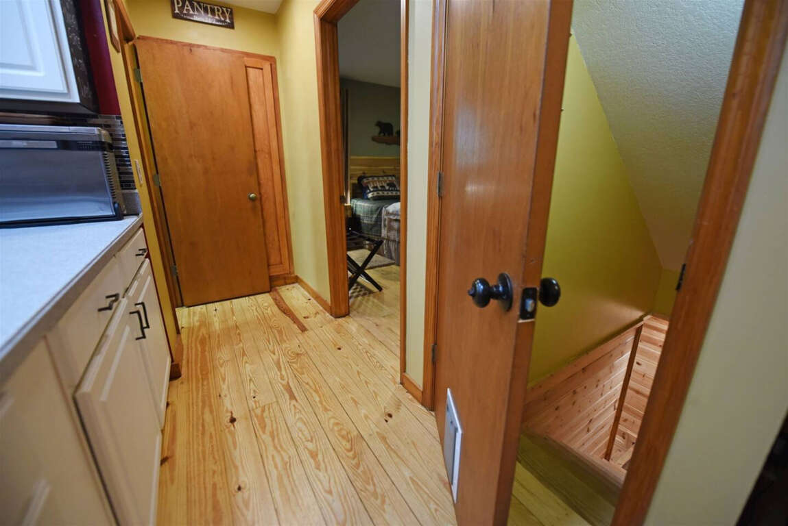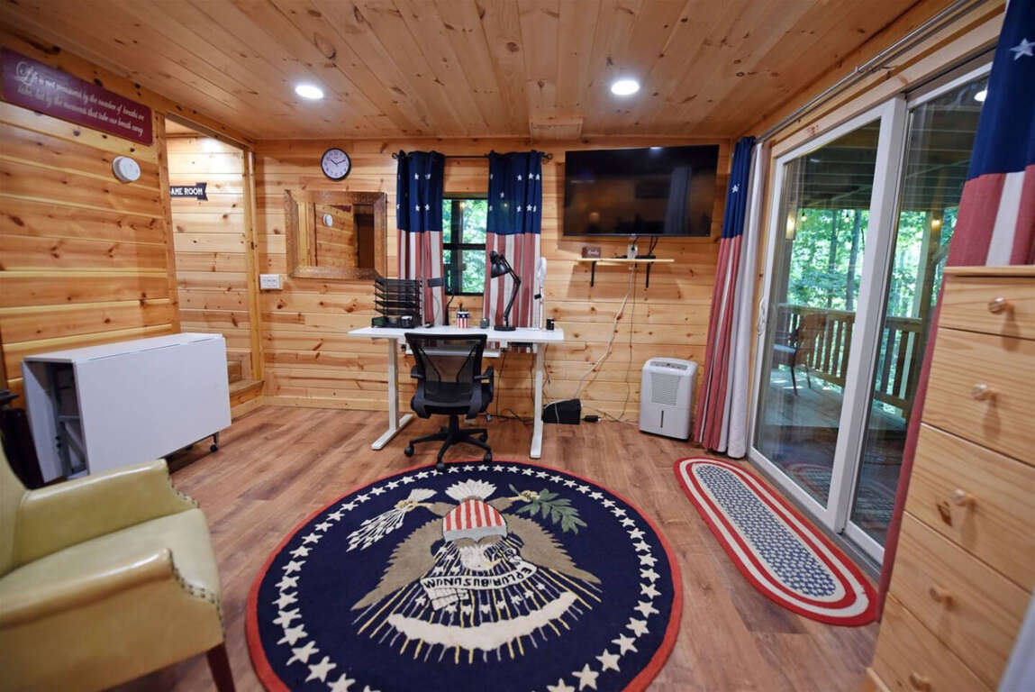 The cabin features three levels, each hosting a bedroom and bathroom to offer privacy and convenience. Each of the three bedrooms showcases its unique rustic theme. The upstairs "Mountain Bliss" suite boasts a king-sized Aspen log bed and a private bathroom. The main level "Hickory Hideaway" features a king-sized bed and a built-in hickory vanity. The lower-level "Bears Den" includes a queen-sized Pine log bed and an attached office space.