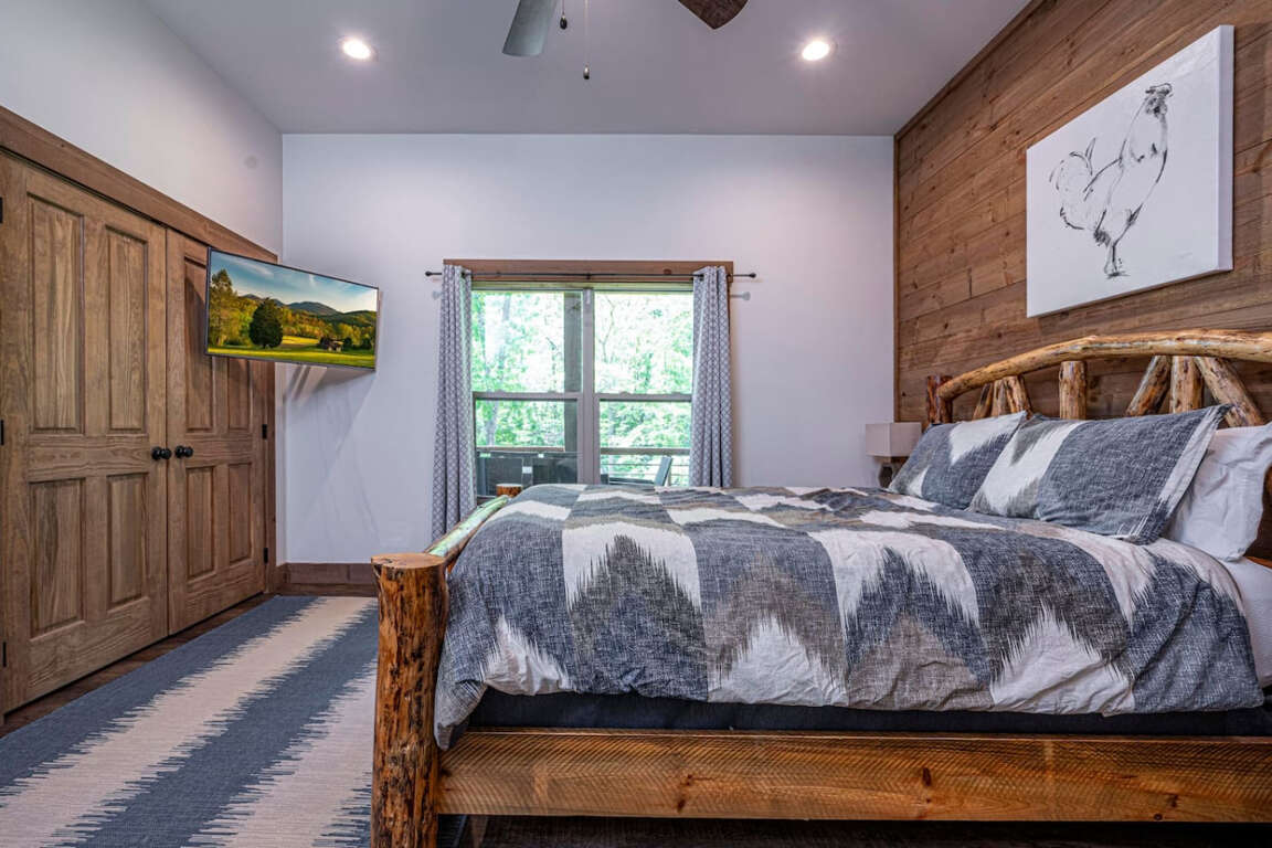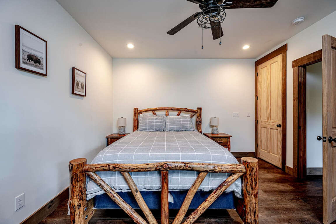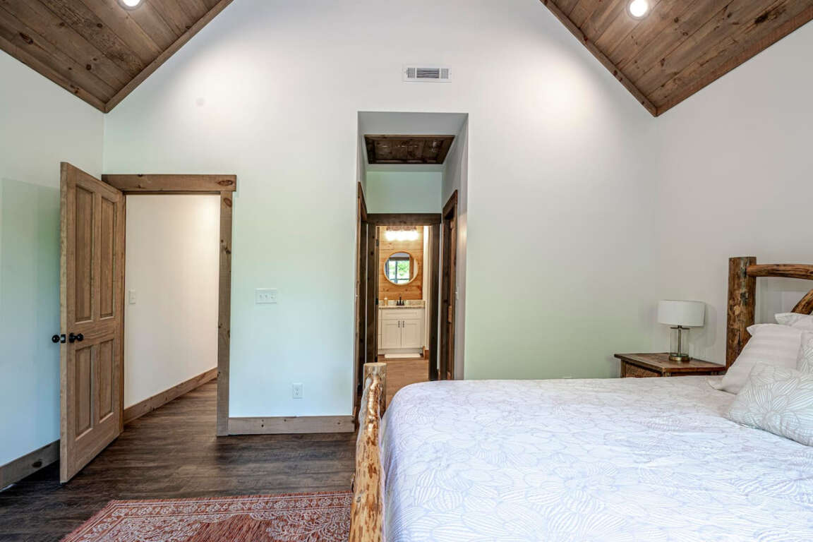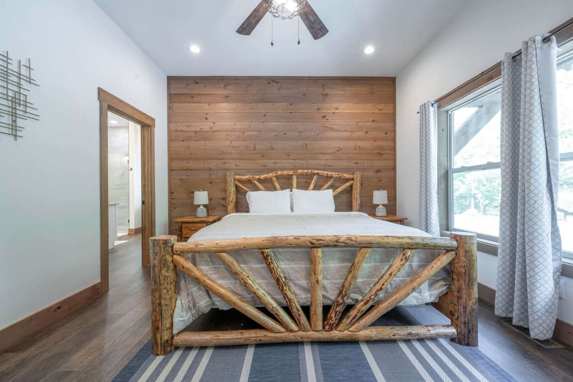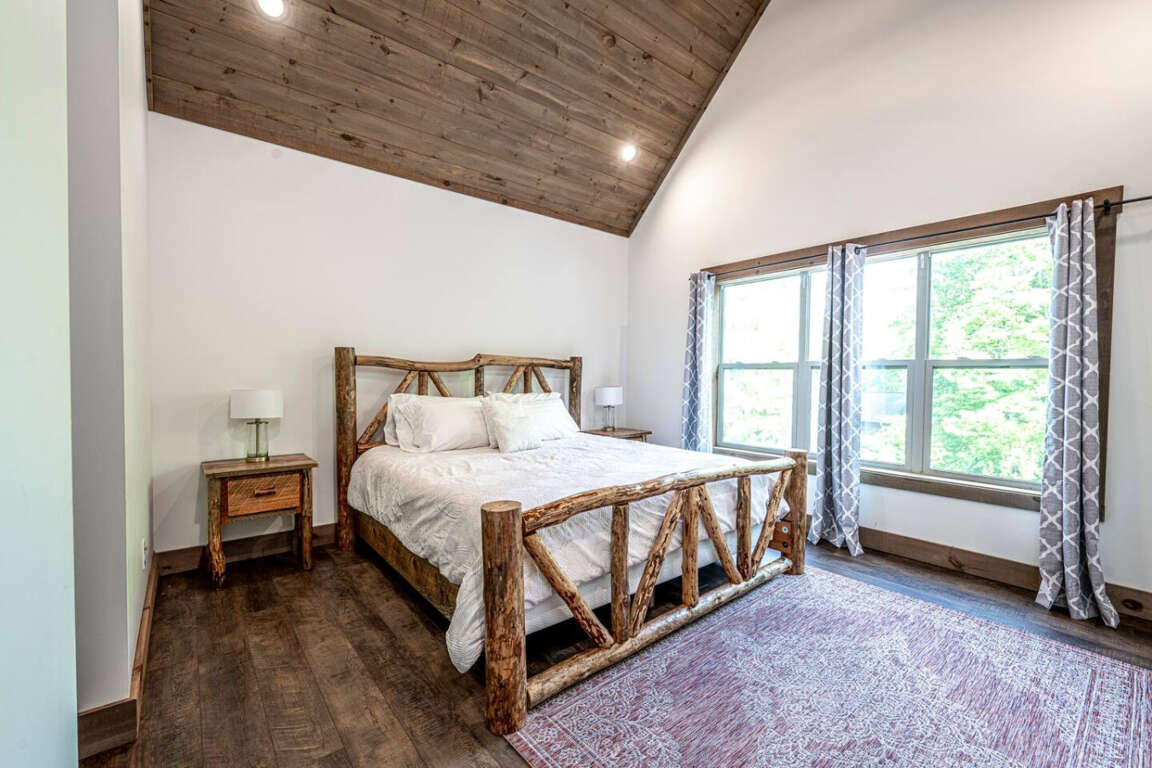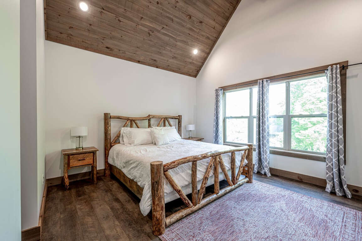 The cabin offers four bedrooms (plus flexible spaces) designed for comfort and privacy. The master suite is a true retreat with a spa-like bath, soaking tub, tile shower, and walk-in closet. Every room is crafted for rest after a day of adventure.