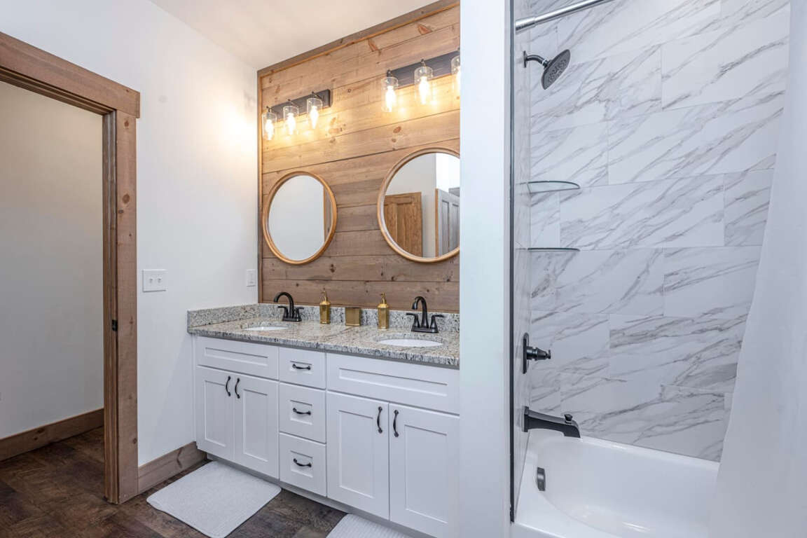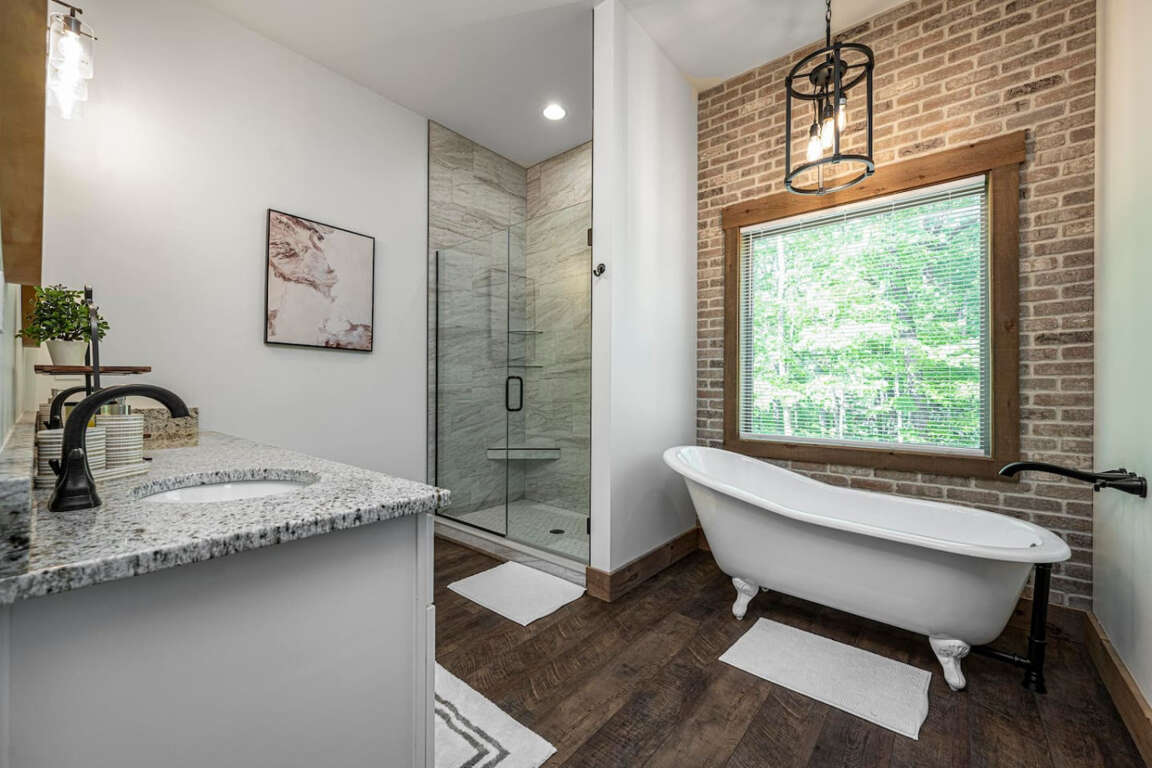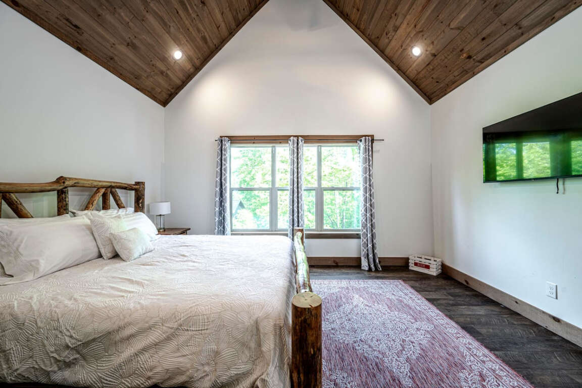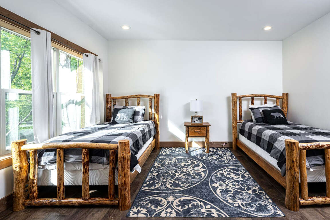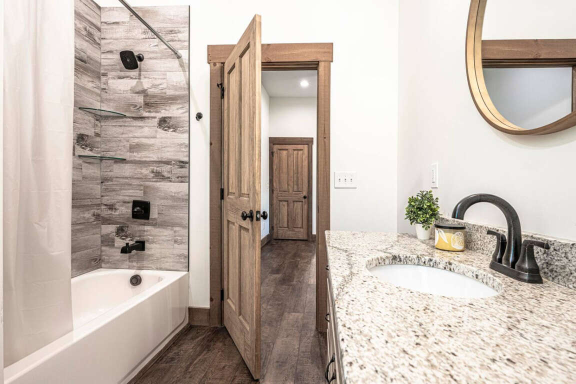 The cabin offers four bedrooms (plus flexible spaces) designed for comfort and privacy. The master suite is a true retreat with a spa-like bath, soaking tub, tile shower, and walk-in closet. Every room is crafted for rest after a day of adventure.