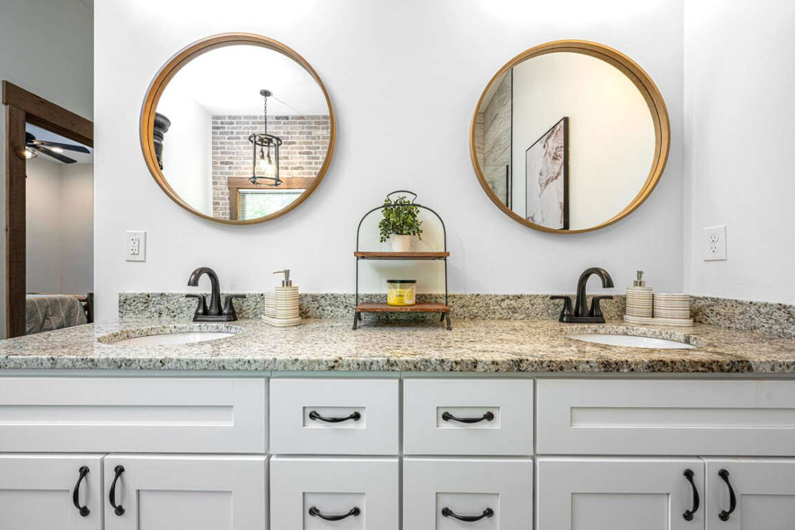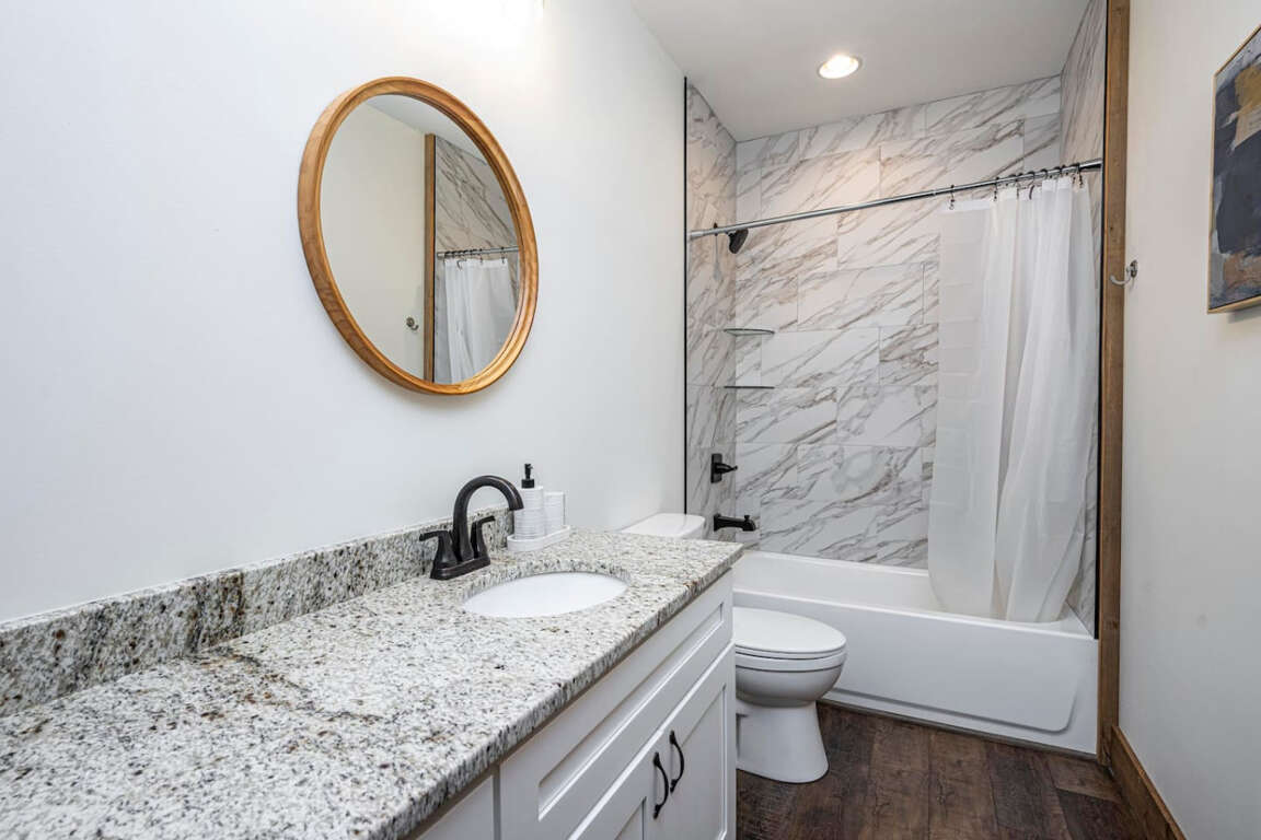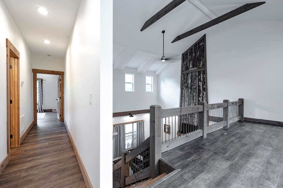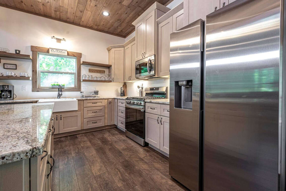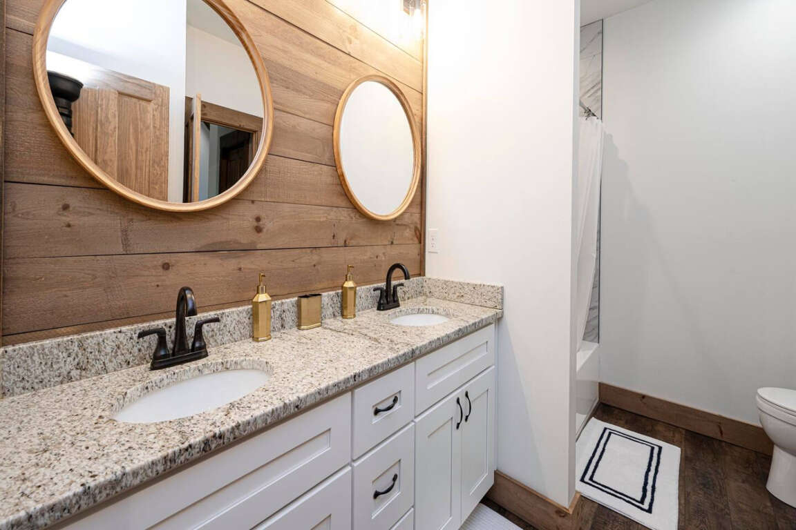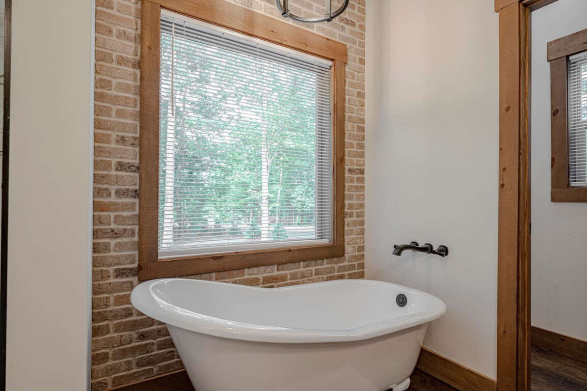 The cabin offers four bedrooms (plus flexible spaces) designed for comfort and privacy. The master suite is a true retreat with a spa-like bath, soaking tub, tile shower, and walk-in closet. Every room is crafted for rest after a day of adventure.