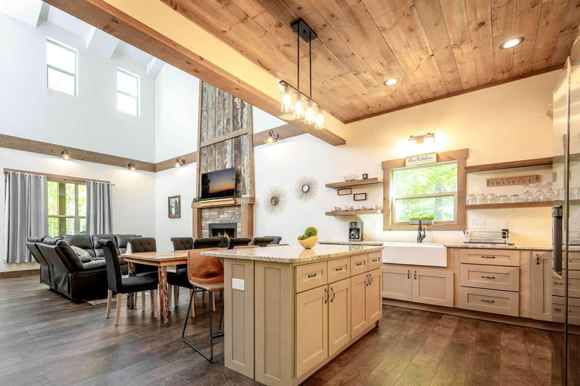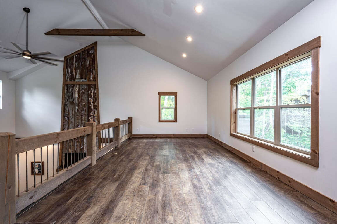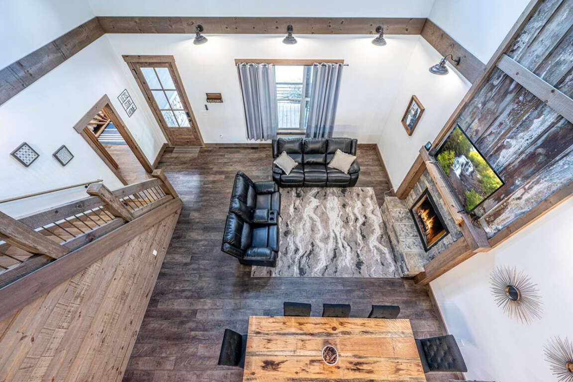 The main level features an open floor plan with soaring cathedral ceilings and a dramatic stacked-stone fireplace that instantly sets the mood. Gather with loved ones in the spacious great room, enjoy game nights in the terrace-level den, or curl up with a book in the loft overlooking it all.