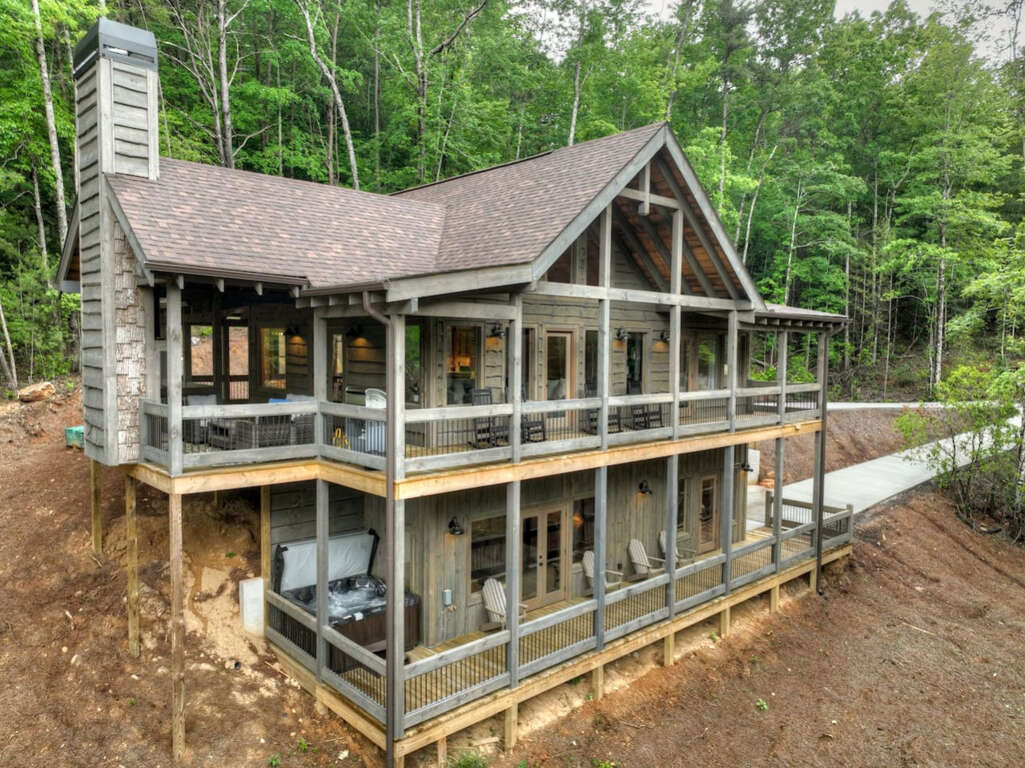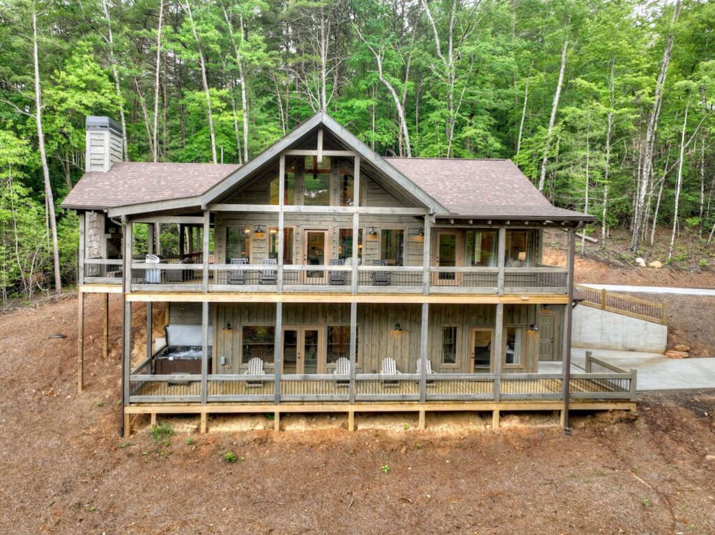 Mountain cabin with long-range views in Epworth, GA, a vacation rental with 3 bedrooms, hot tub, game room, fireplaces, and covered decks near Blue Ridge.