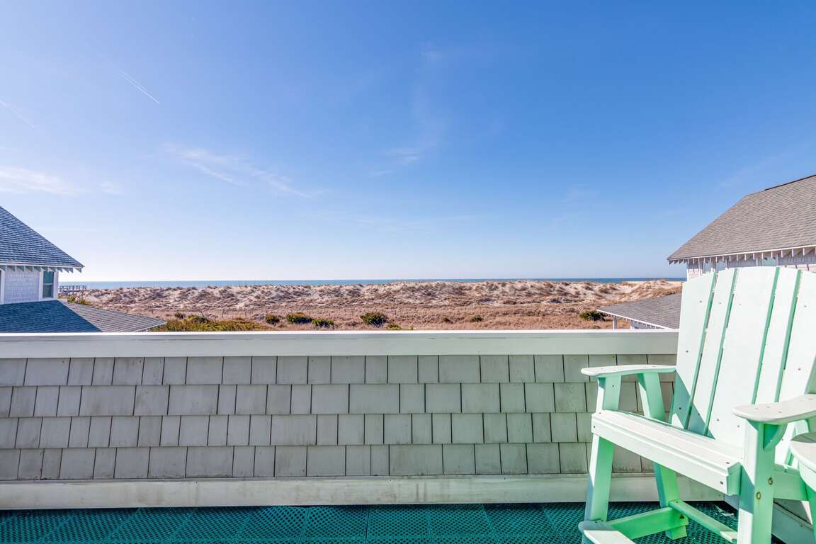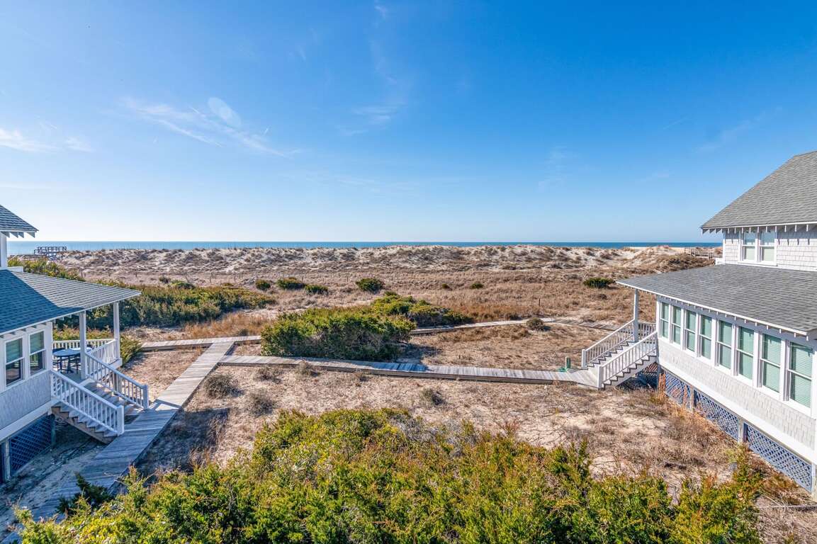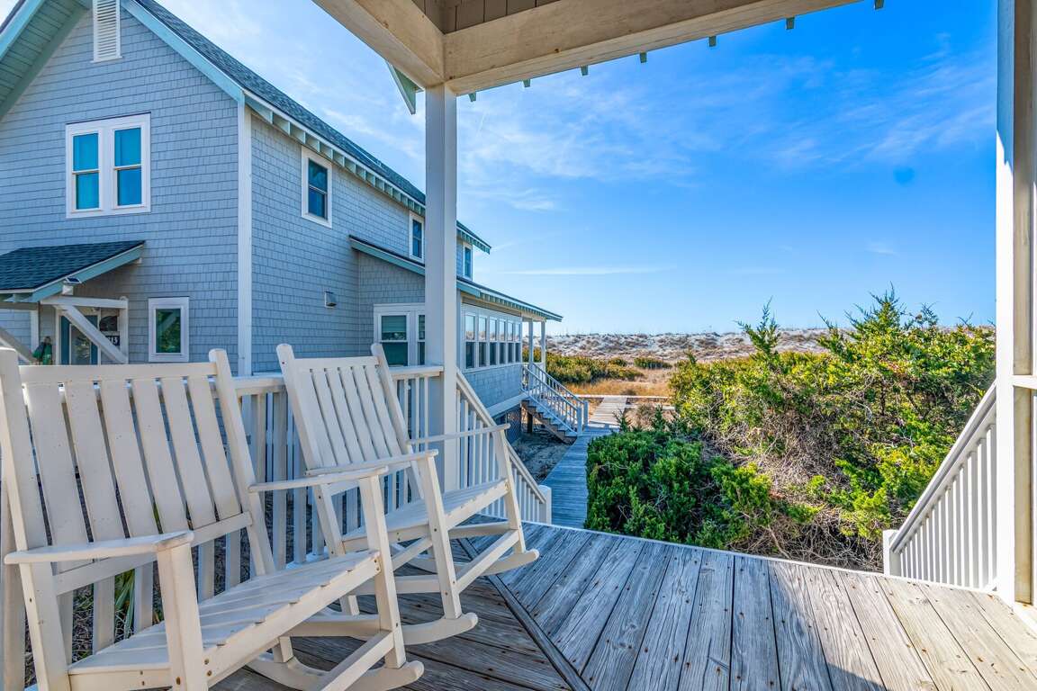 Oceanfront duplex vacation rental in Bald Head Island with direct beach access, 3 bedrooms plus a loft, screened porch, golf cart, and ocean-view balcony.