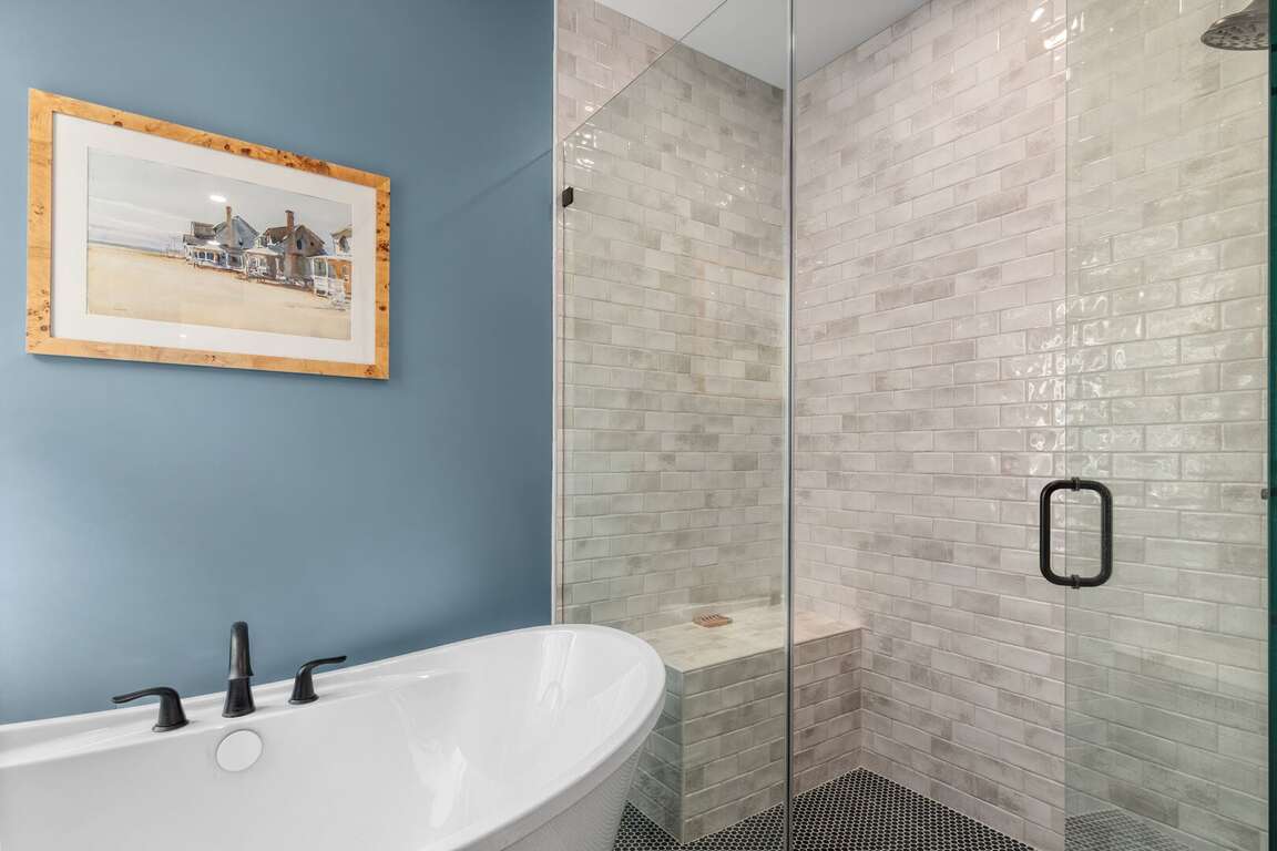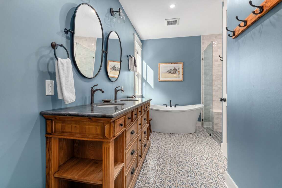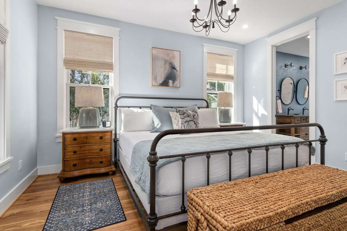 Primary BR (down): king with walk-in closet; large spa-like primary bath including dual vanities, walk-in shower, and separate freestanding soaking tub