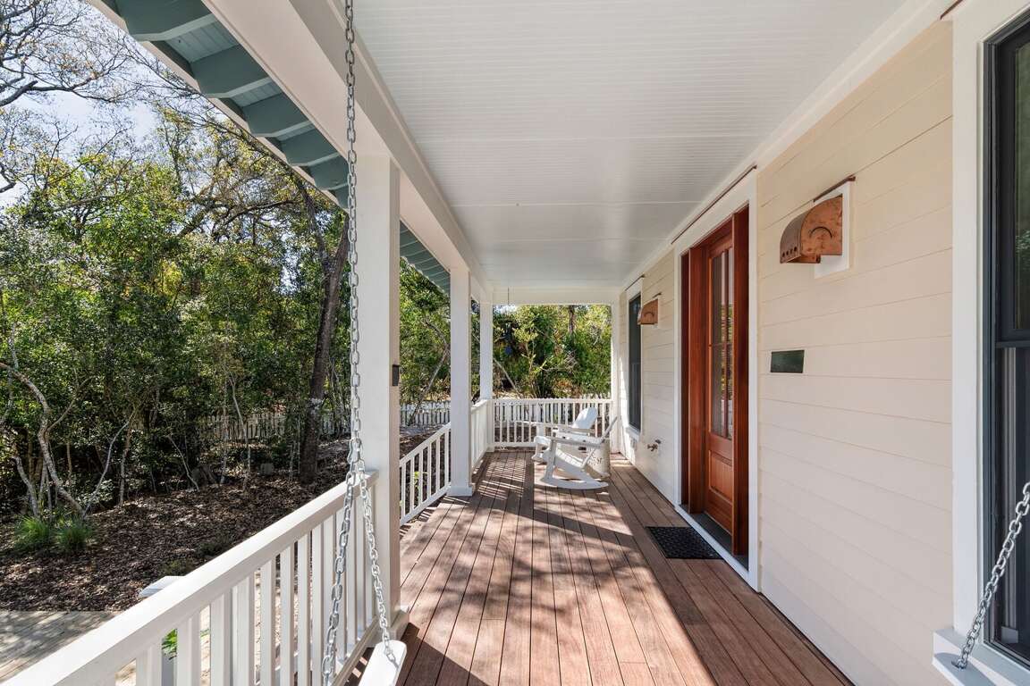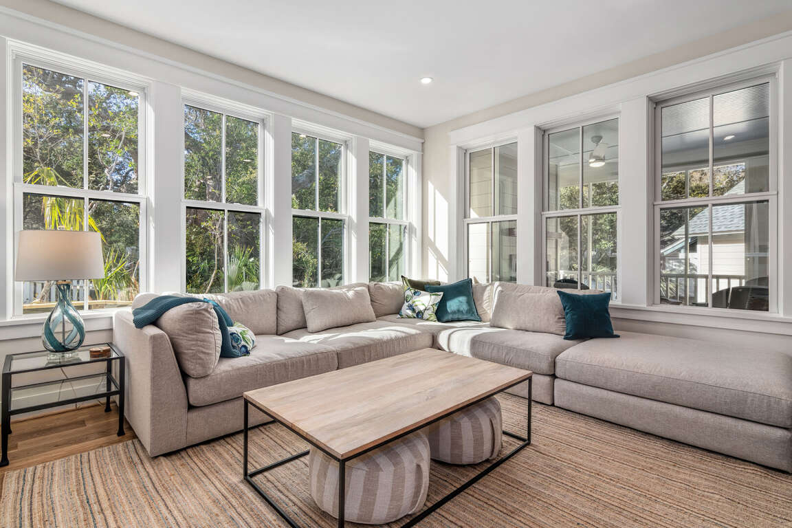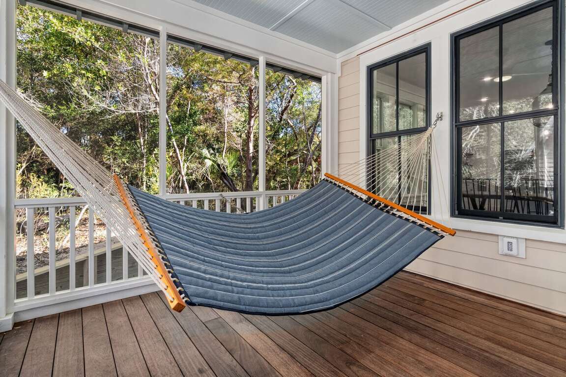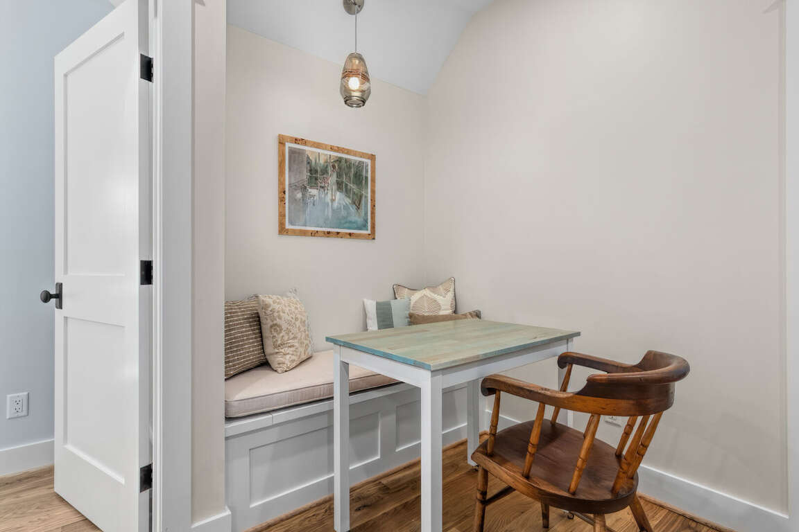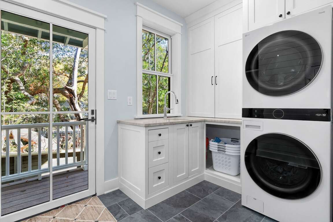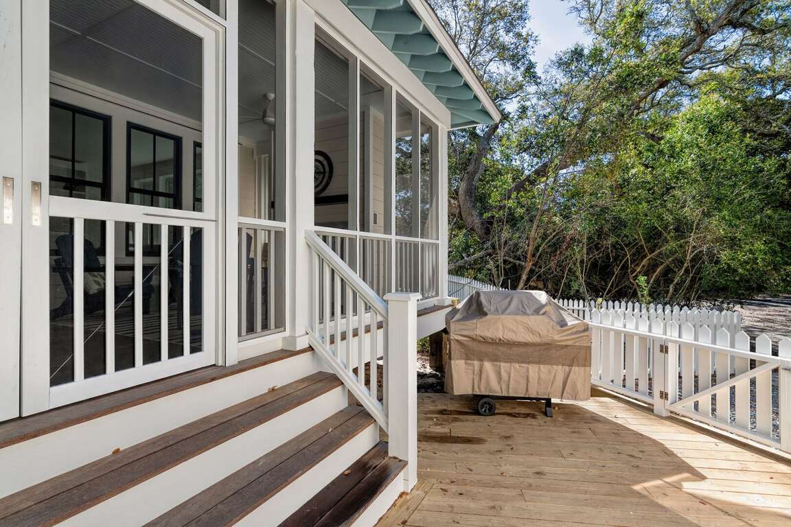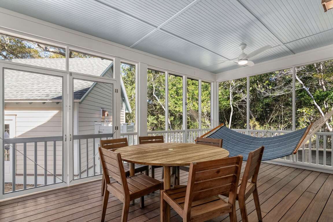 The home is thoughtfully decorated in classic coastal style with new designer furnishings plus the owner’s curated North Carolina art and vintage pieces, with hardwood floors throughout. A luxurious oversize sectional sofa and armchairs downstairs provide a gathering space for the whole family, while a desk and reading chair upstairs offer a quieter getaway space. Multiple choices for dining include a large 8 person indoor dining table, 4 barstools, and outdoor dining table on the screened porch. The convenient main floor laundry room offers its own entrance and an abundance of hooks plus a retractable clothesline.