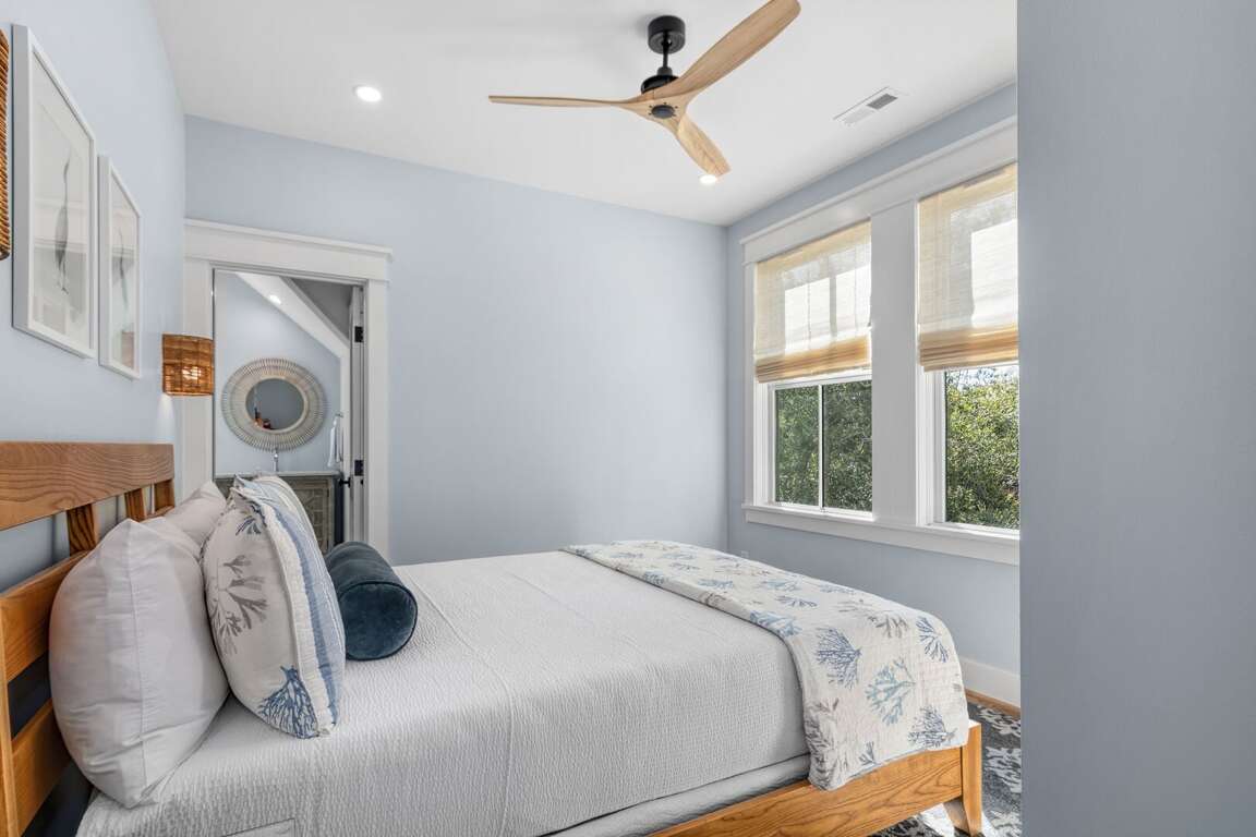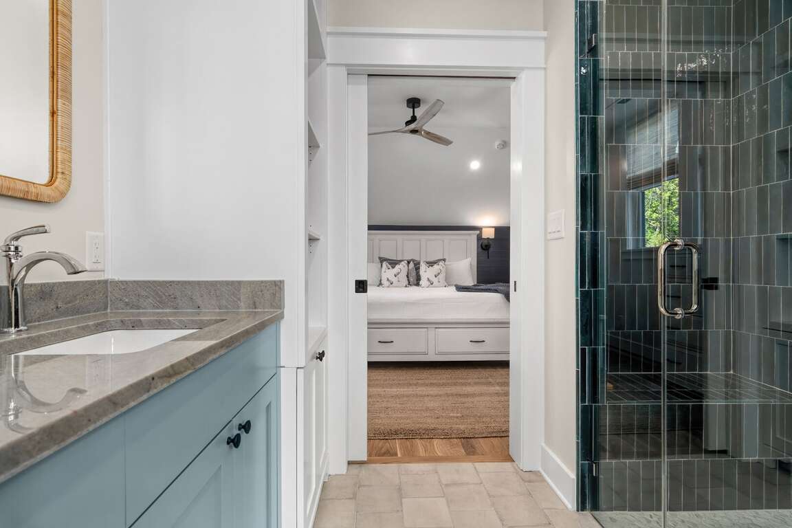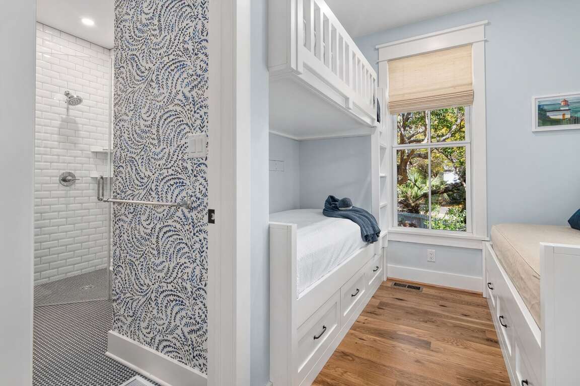 Bedrooms are furnished with Leesa Sapira mattresses, and each bedroom has its own full ensuite bath with custom tile and stone countertops. The primary downstairs bedroom features a king with walk-in closet, and a large spa-like primary bath including dual vanities, walk-in shower, and separate freestanding soaking tub. A downstairs bunk room includes 3 twins and adjoining bath with walk-in shower. A second primary suite upstairs includes a king, walk-in closet, dual vanities and walk-in shower. The second upstairs bedroom suite features a queen and walk-shower, while the fourth includes both a queen + bunk recess with 2 twins and tub/shower combo. There is generous storage in each bedroom including built-in shelving, drawers and closets.