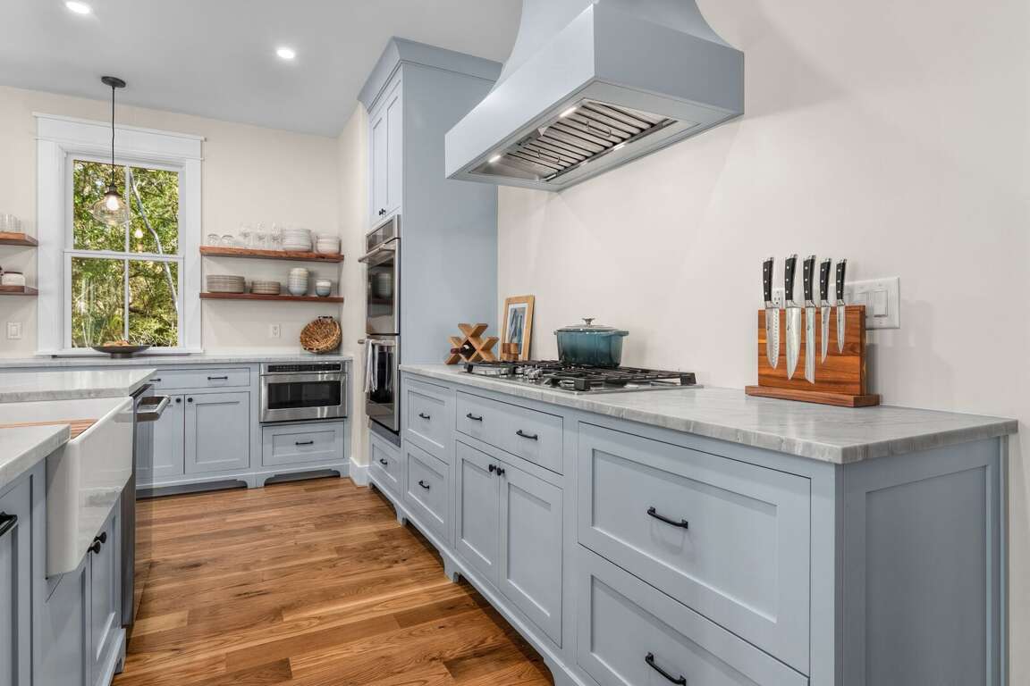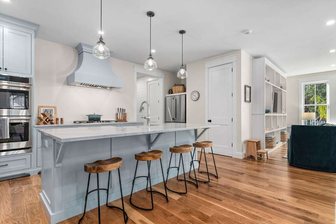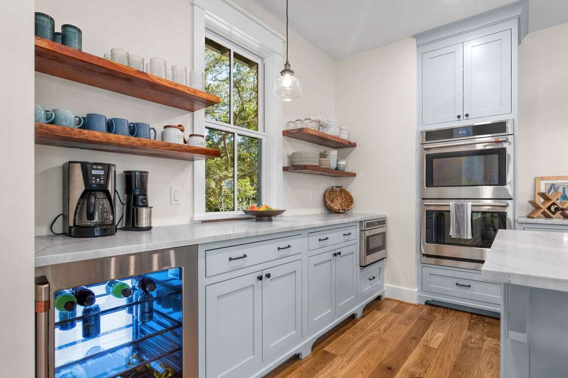 The fully equipped chef’s kitchen features new GE Café appliances including a 36 inch gas range, dual electric ovens, dishwasher, microwave drawer, large refrigerator and separate beverage fridge, quartzite countertops, custom cabinetry and a walk-in pantry. You will enjoy traditional drip plus Keurig coffee makers, a large new collection of pots, pans, bake and serve ware, and nany small appliance “extras” including electric tea kettle, blender, waffle maker, slow cooker and more.