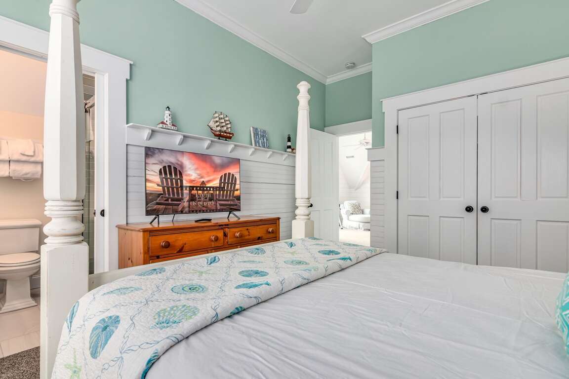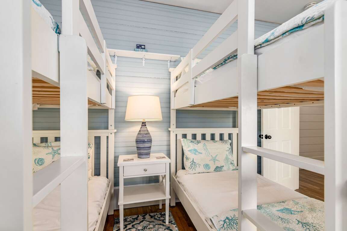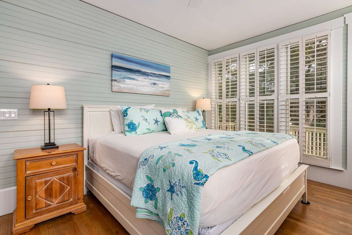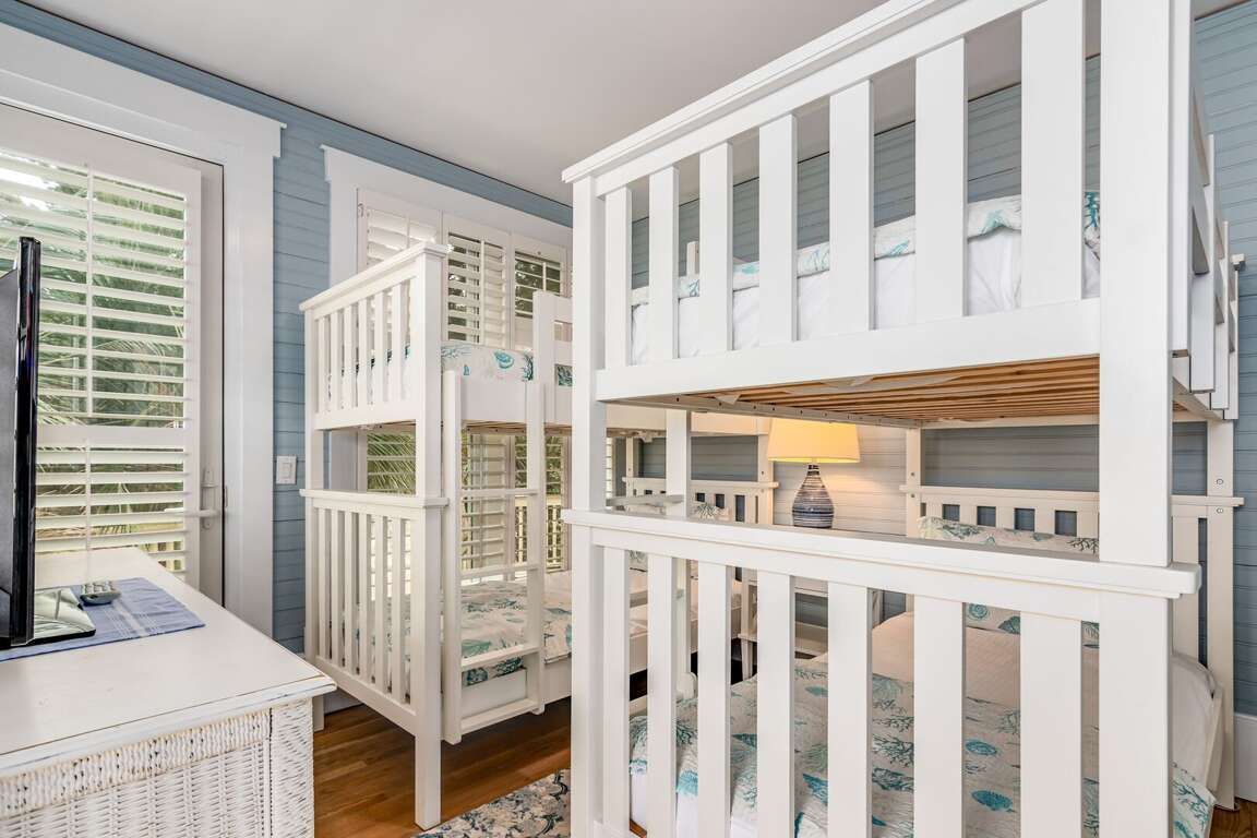 Down the hallway, past the kitchen, are two bedrooms, the laundry room and a full bath. The first bedroom is the Primary King, featuring an ensuite bath and walk-in closet. Next to the it is a bunk room, containing two bunk beds. Both the bunk room and the King have private access to porches, making them one step closer to paradise.