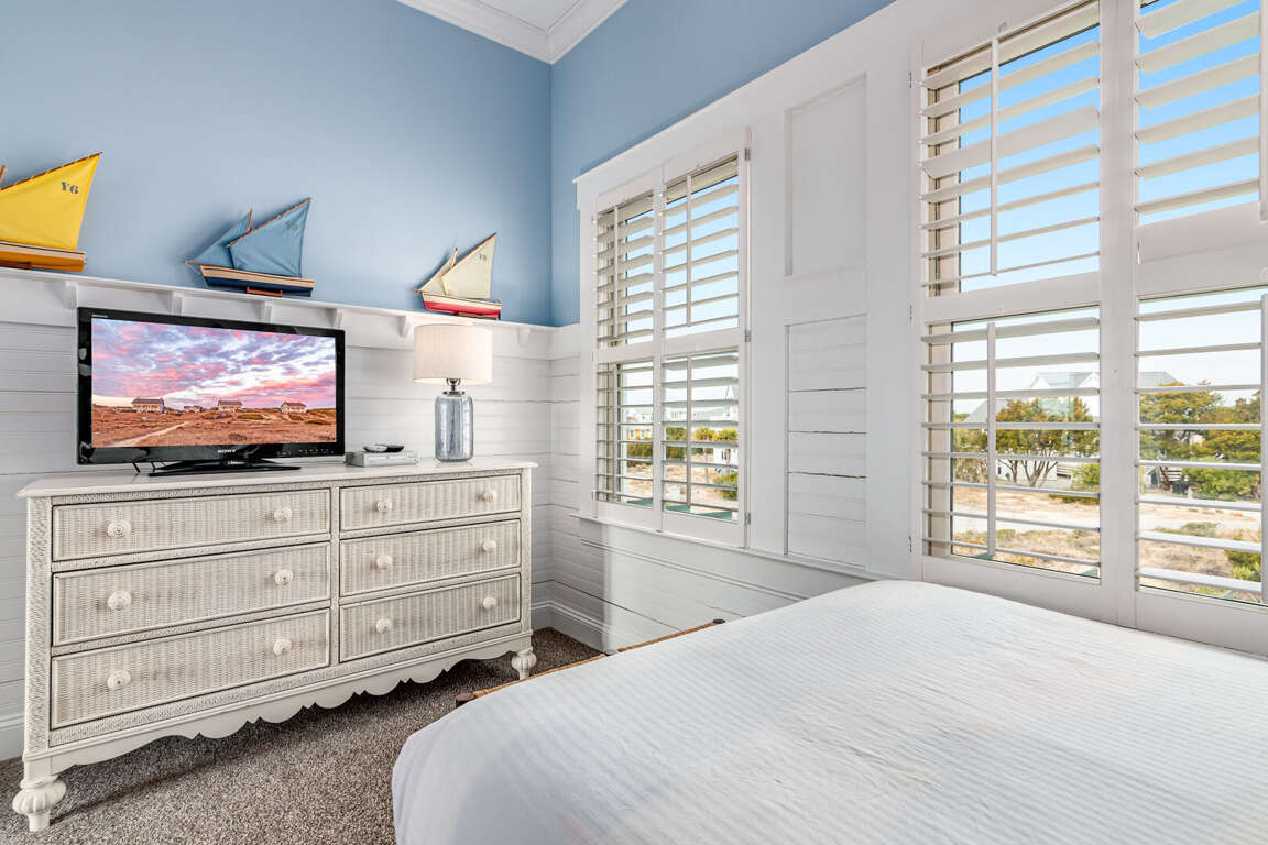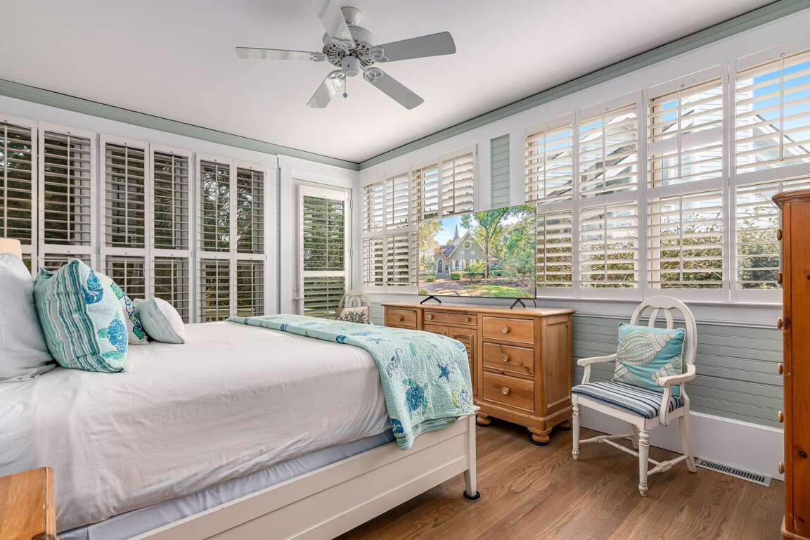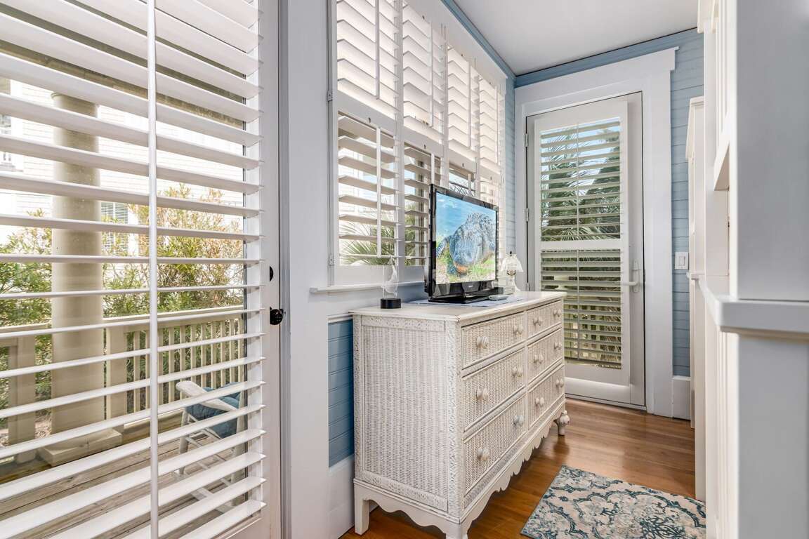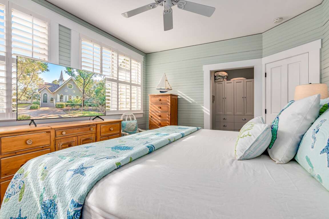 Down the hallway, past the kitchen, are two bedrooms, the laundry room and a full bath. The first bedroom is the Primary King, featuring an ensuite bath and walk-in closet. Next to the it is a bunk room, containing two bunk beds. Both the bunk room and the King have private access to porches, making them one step closer to paradise.