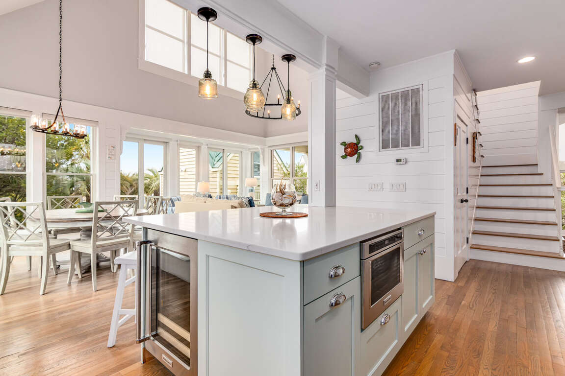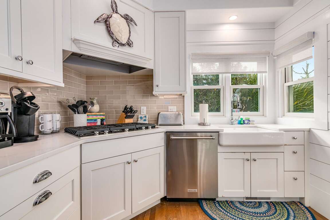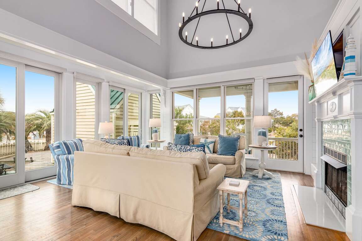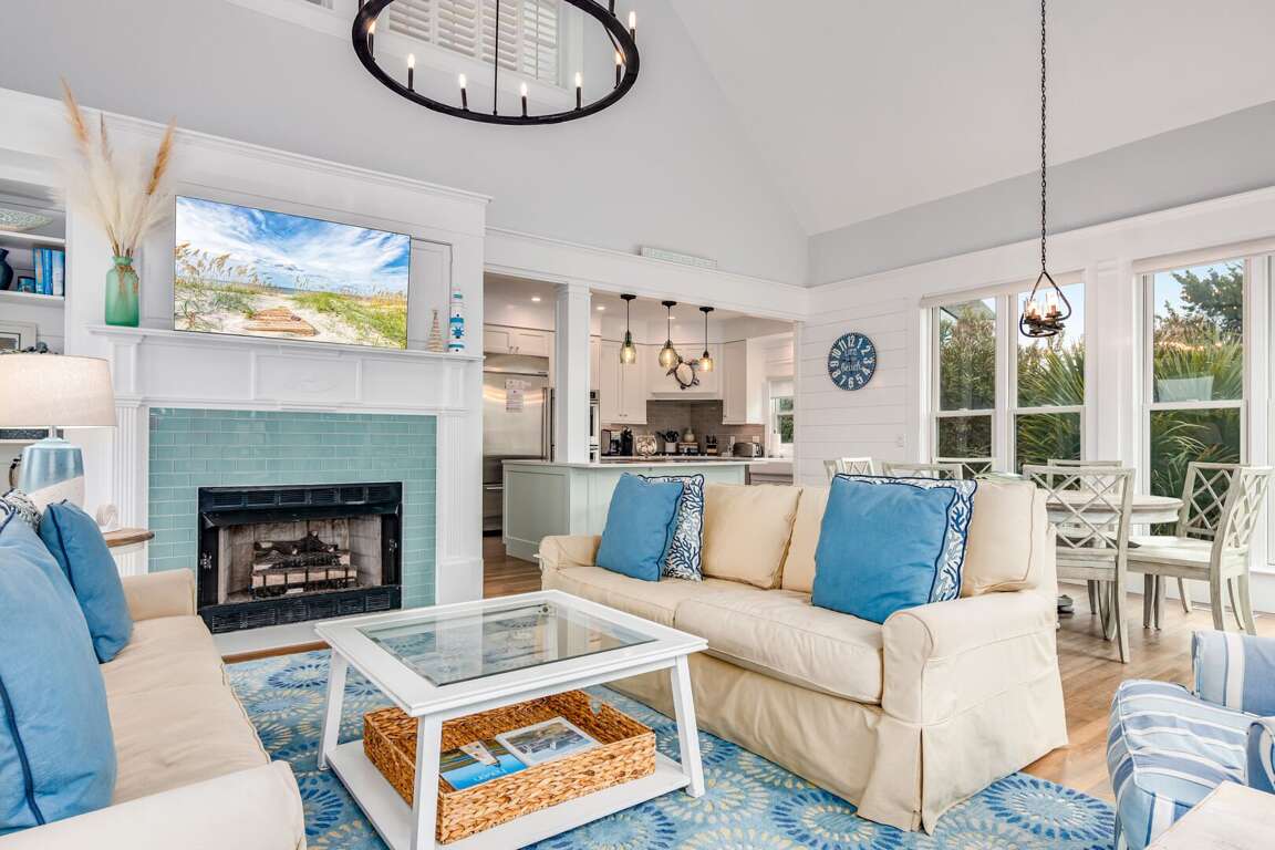 Totally renovated, this sunny family beach home offers plenty of comfy indoor and outdoor spaces-relaxation has never been made so easy! Seas the Day's bright and airy open floor plan is made for gathering family and friends. Anchored around a decorative fireplace, the generous living area welcomes you for conversation, game-playing or movie-watching. The nearby dining space, bathed in natural light, is perfect for meals or snacks and is adjacent to the completely updated kitchen-now equipped with top-of-the-line Kitchen Aid appliances, custom cabinetry, sparkling countertops, a farmhouse sink and a spacious island offering not only prep space but also seating. If al fresco dining is your preference, the recently redesigned back deck provides a new dining set and nearby gas grill-both ensconced in privacy-ensuring foliage.
