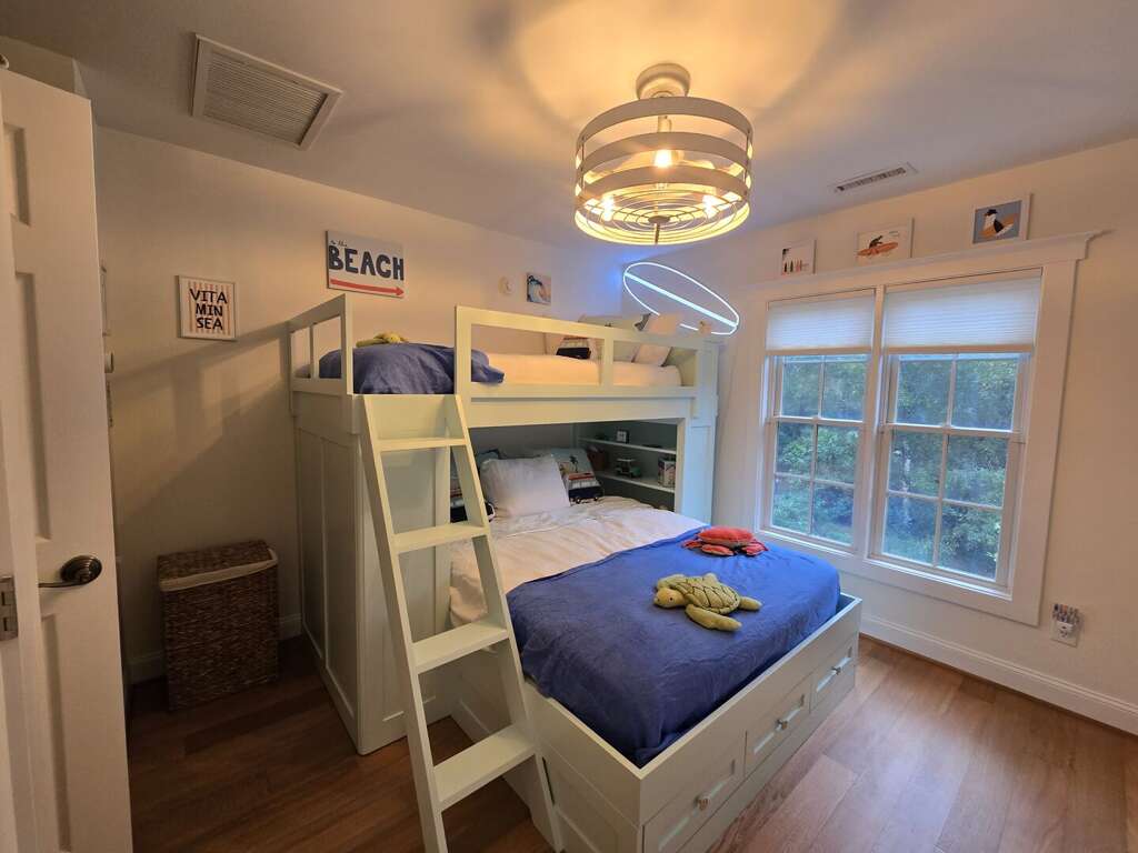 Upstairs, a bright, balconied hall overlooks the living area and is stocked with local guides, books, and puzzles. This level includes a cheerful bedroom that sleeps three in a queen-under-twin custom built-in bed and a fun bunk room with four built-in bunks, ship-style lighting, and bean bag seating—an ideal hangout for children. These rooms share a convenient hall bath. Across the balcony, a second Queen Primary suite provides a full ensuite bath, and direct access to a private, sunny deck.