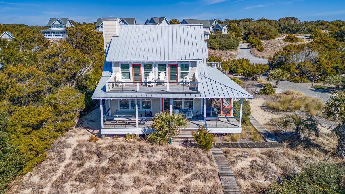 Southwind is a 5-bedroom house in Bald Head Island with dune views, multiple porches and decks, plus a private boardwalk path to South Beach for a vacation rental.