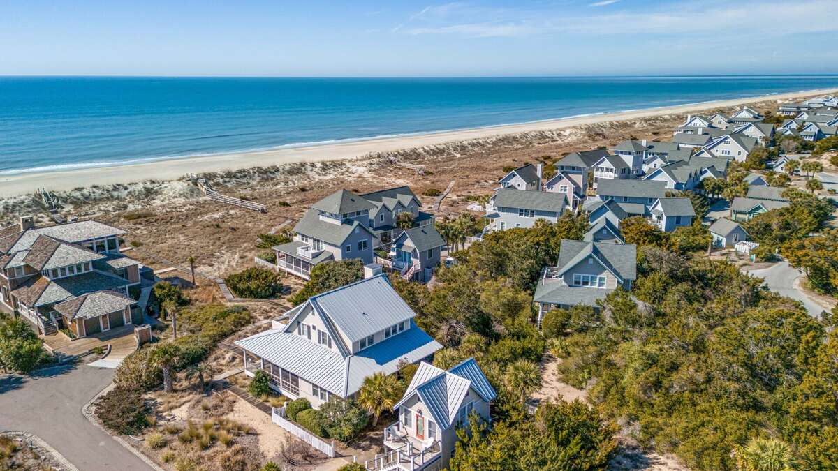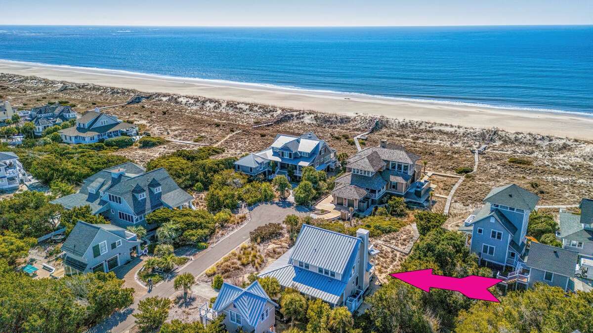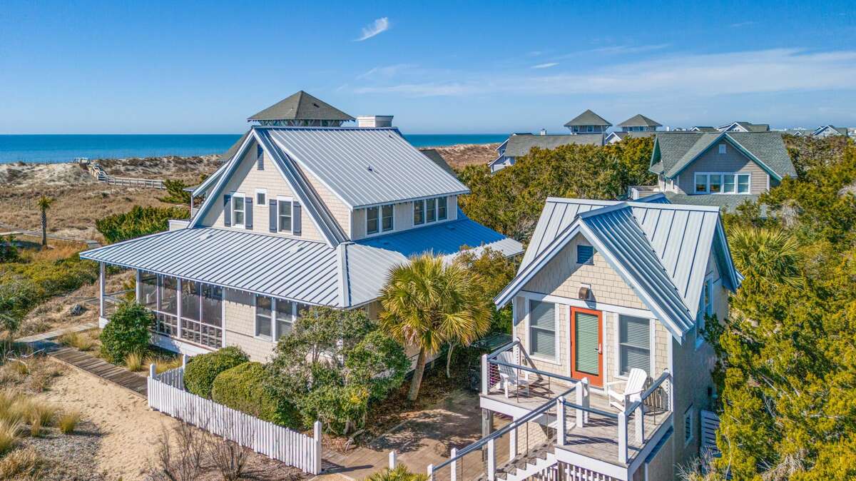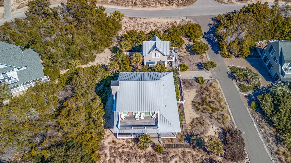 This five bedroom, 4.5 bath, oceanfront 2nd Row Bald Head Island sanctuary delivers sun-drenched holidays just steps (down the semi-private boardwalk) to sandy South Beach. Cross through the cloistered yard onto the cozy, covered front porch. Then enter the sunny, vaulted foyer where you are welcomed to relax on the charming built-in bench. From here, warm hardwoods lead you to the open floor plan’s spacious, natural light-filled living area-an inviting and comfortable spot that’s perfect for family games and movie-watching. However, this space’s highlight is its dune views through its back wall of windows. Enjoy that perspective from inside or step out onto the house-length covered back deck, where rocking chairs beckon you to stop and savor briny breezes or grab a snack and munch at the picnic table while listening to waves breaking on the shore. Back inside, the bright, generous dining area, cornered by more walls of windows, offers access to the third outdoor living space-a screened side porch that houses a conversation area as well as a tasteful dining set-ideal for alfresco meals. The home’s multi-chef kitchen bestows an outdoor table as well as a breakfast bar seating for three, stainless appliances and plenty of prep space and storage. On the other side of this level, a cheery Primary Queen suite pampers with three closets, its own ensuite with a tub, shower and double vanity and its own entry to the screened porch. A powder room completes this floor. Upstairs are three more sunlit corner Queen bedrooms. The first and second share a Jack and Jill bath with a double vanity. The latter also boasts panoramic seascapes from inside and through its door to the second level’s house-length sundeck. This perch is where you’ll end your days mesmerized by the beauty of the sun setting over the water. It’s spectacular every evening! Another Queen suite also bestows sun deck entrée and stunning Atlantic aspects as well as its own full bath ensuite. Additionally, the laundry is conveniently located on this floor. For those desiring more privacy, the home’s crofter provides its own deck with glimpses of the ocean just outside a thoughtfully appointed Queen suite that features a sitting/TV space and coffee bar with a sink and mini fridge. Centrally situated between the two clubs, close to the Conservancy and shops, supplying two four-passenger golf carts for guest use, furnishing two outdoor showers, including a fun party deck on the beach access close to the sand. One stay at Southwinds will make it your BHI vacation go-to home year after year.