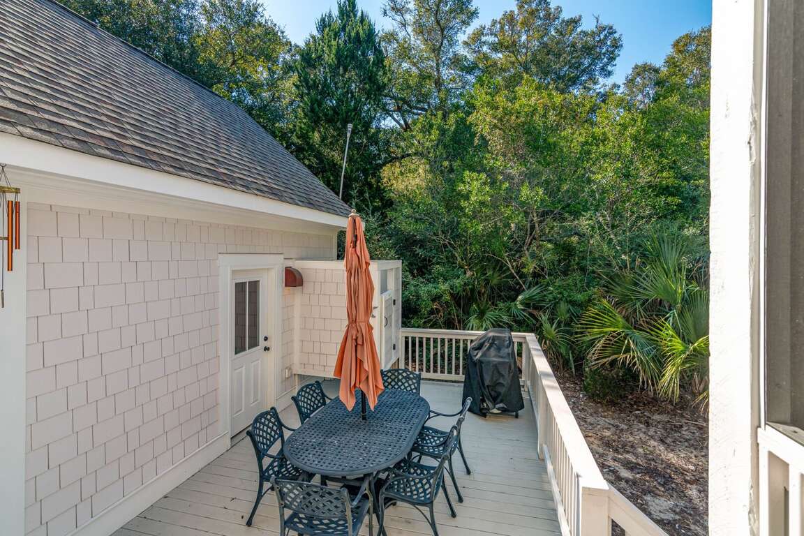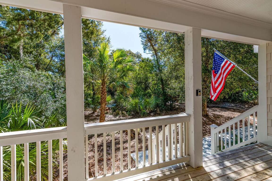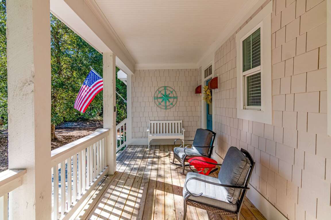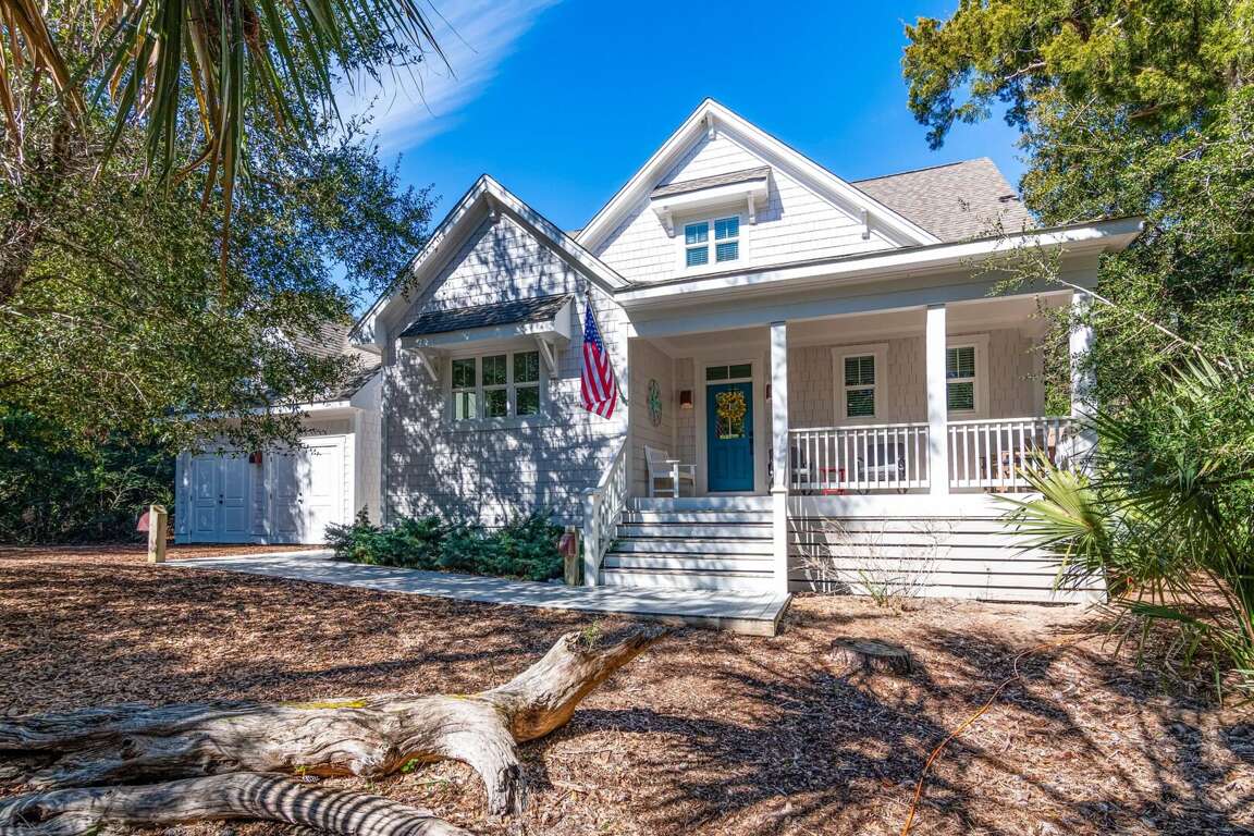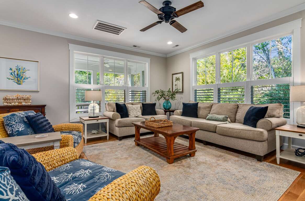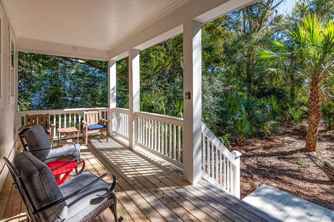Enjoy true indoor/outdoor living with a welcoming front porch, screened-in porch with seating and dining, and an open deck featuring outdoor dining, gas grill, and outdoor shower. Two golf carts (6-passenger + 4-passenger) are included, making beach days and island exploring effortless.