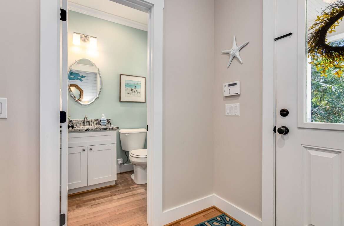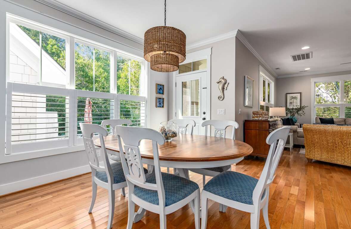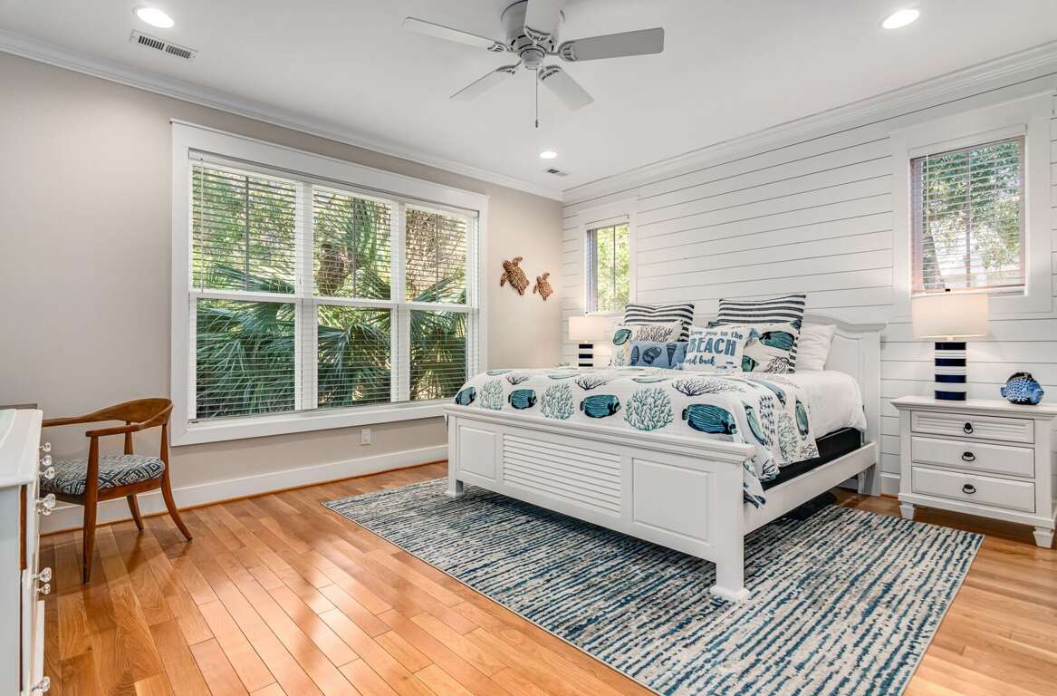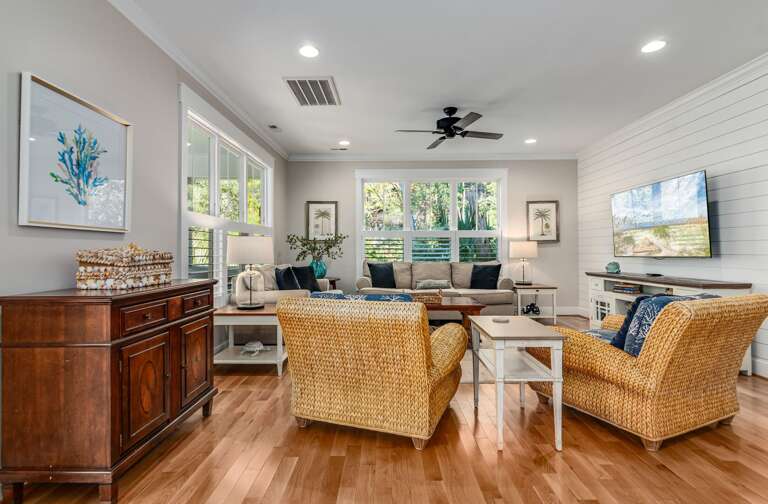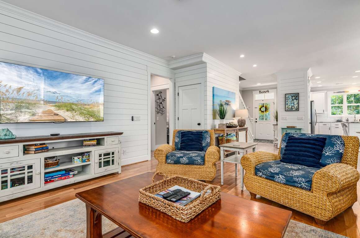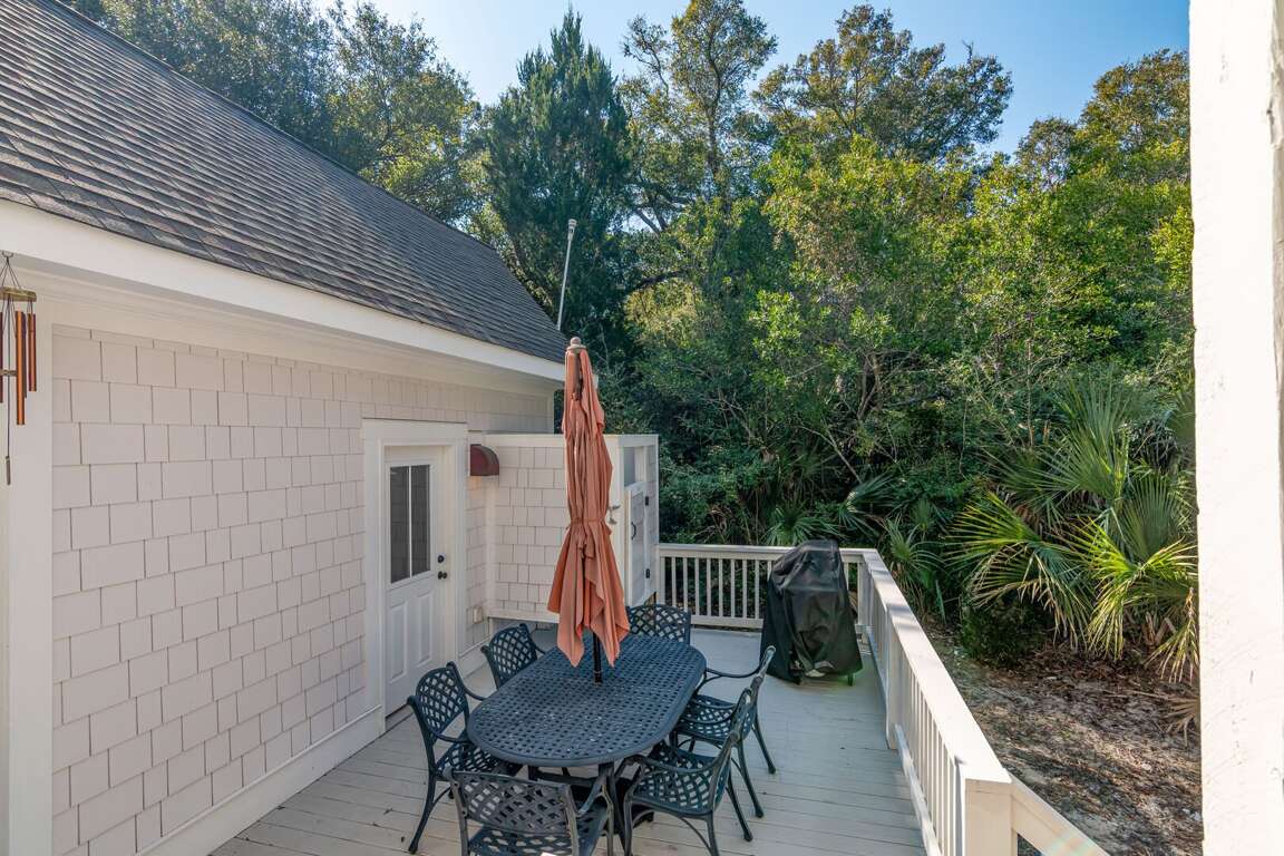 Enjoy true indoor/outdoor living with a welcoming front porch, screened-in porch with seating and dining, and an open deck featuring outdoor dining, gas grill, and outdoor shower. Two golf carts (6-passenger + 4-passenger) are included, making beach days and island exploring effortless.