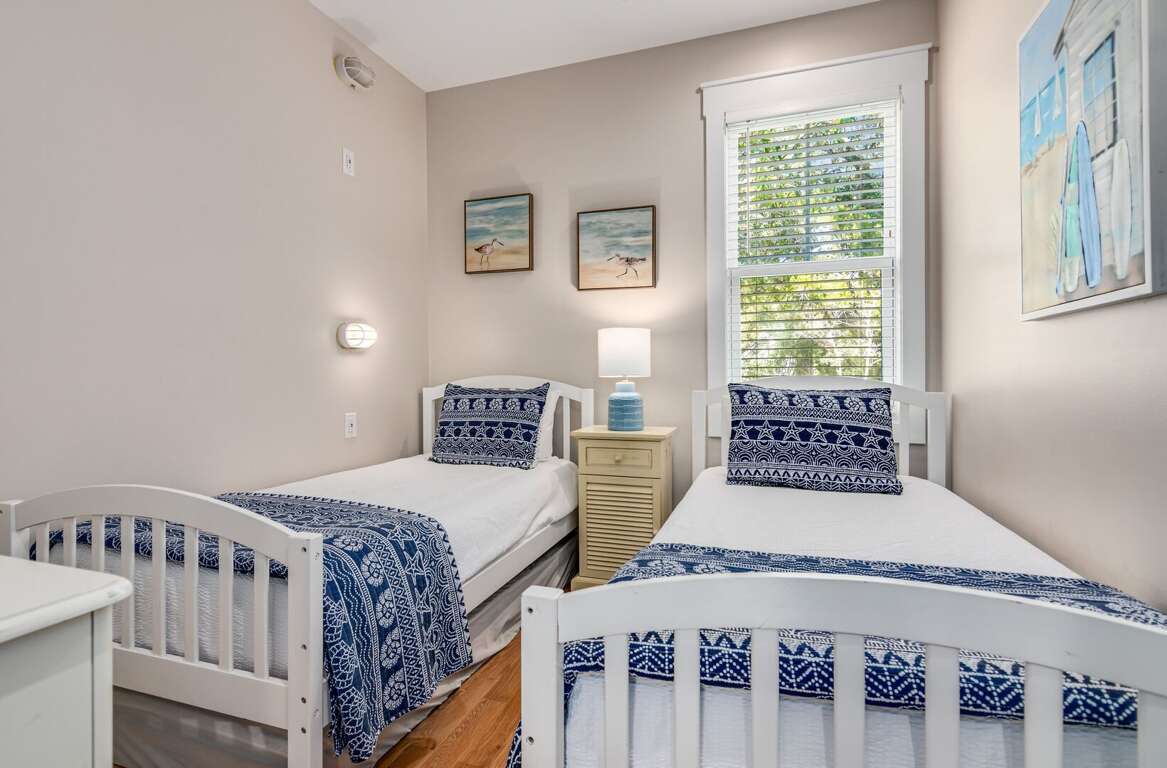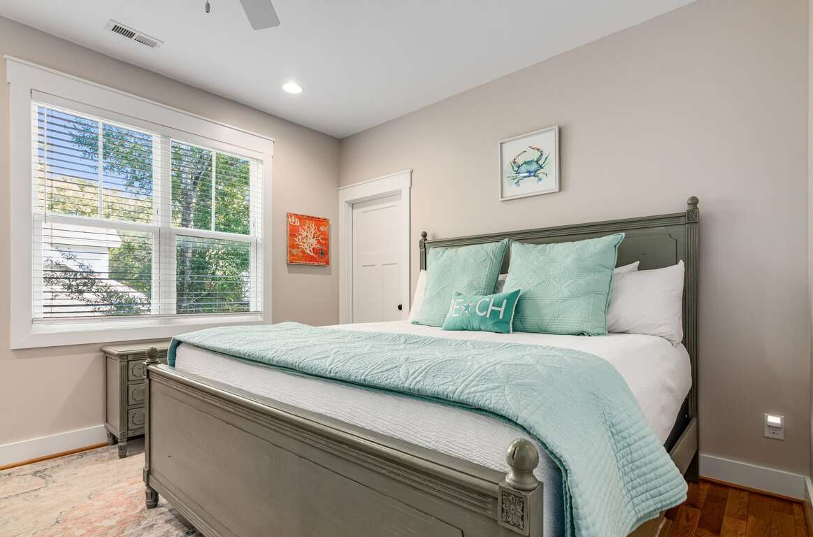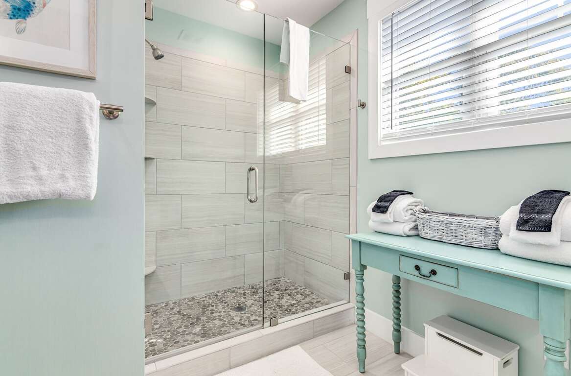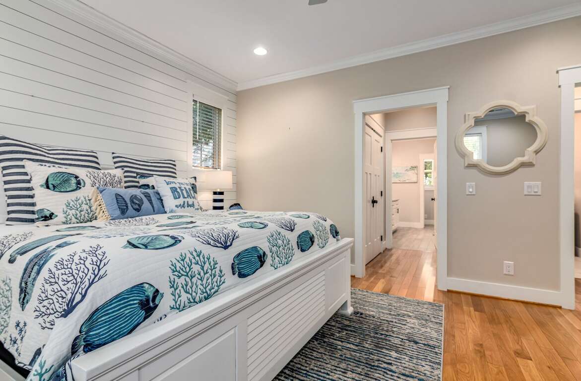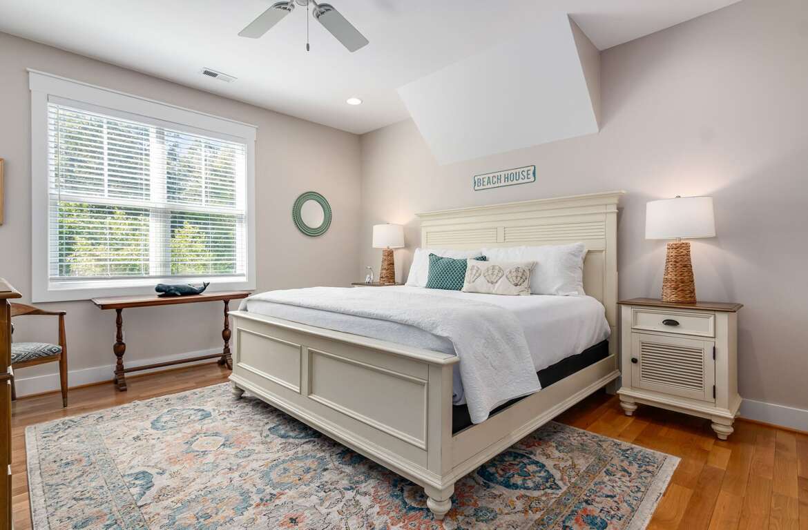 The first-floor primary suite offers a king bed, TV, workspace, and a spa-style bath with a walk-in glass shower and double vanity. Upstairs includes two king bedrooms (one with a private ensuite), a kids’ room with two twin beds, and an additional full bathroom. Sleeps up to 8 guests.