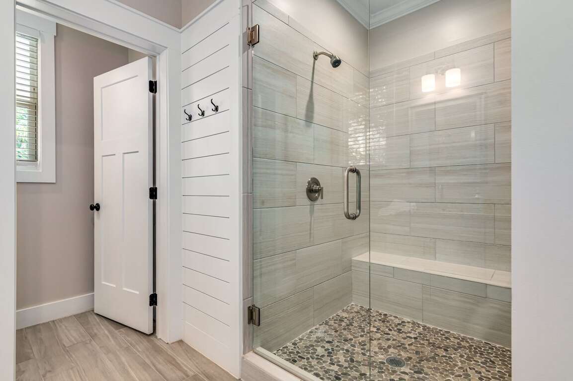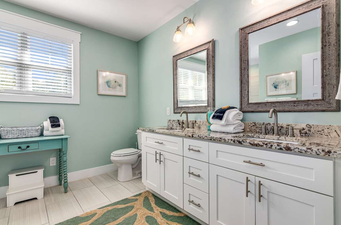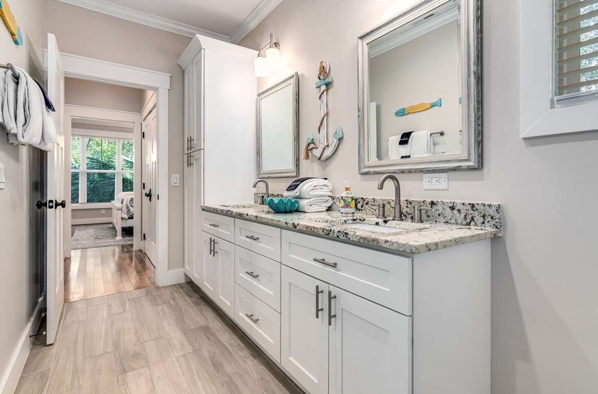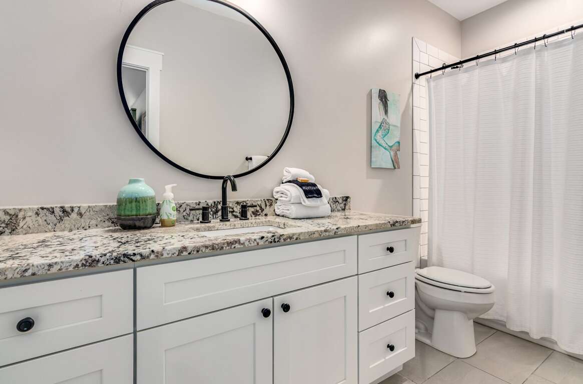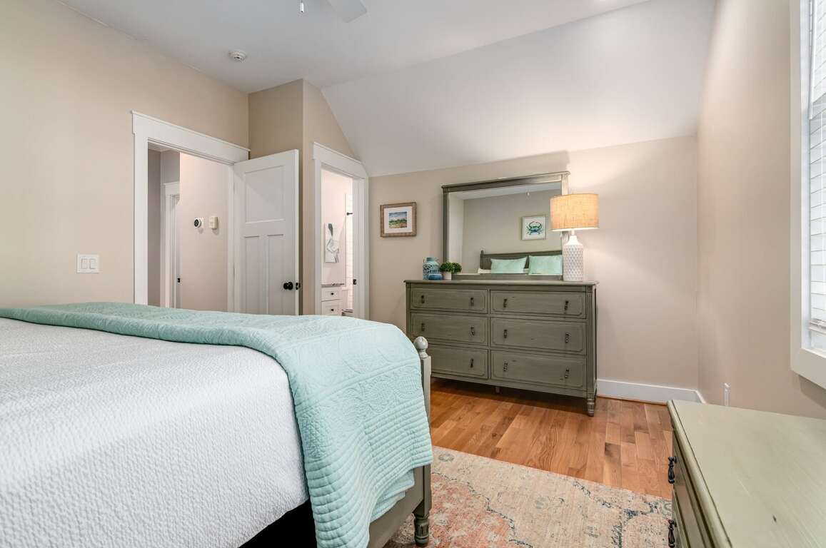 The first-floor primary suite offers a king bed, TV, workspace, and a spa-style bath with a walk-in glass shower and double vanity. Upstairs includes two king bedrooms (one with a private ensuite), a kids’ room with two twin beds, and an additional full bathroom. Sleeps up to 8 guests.