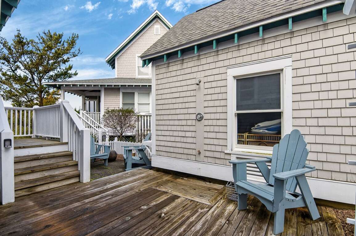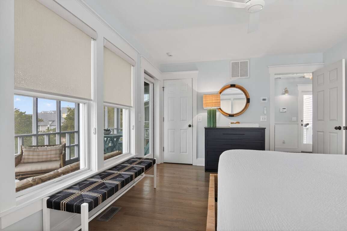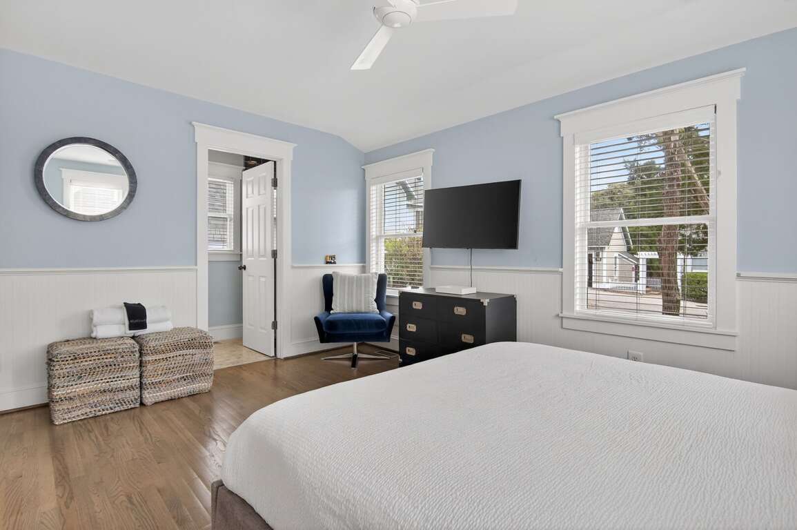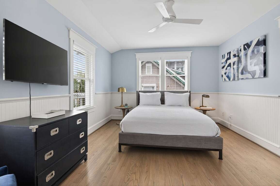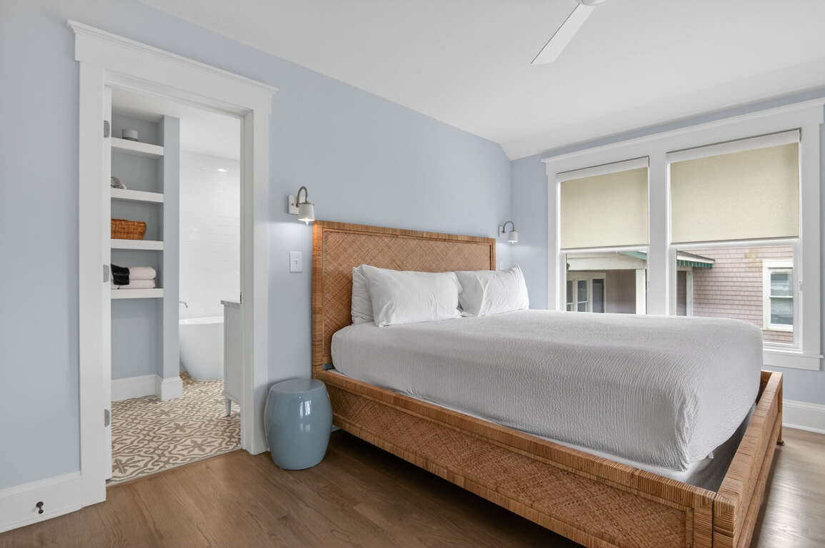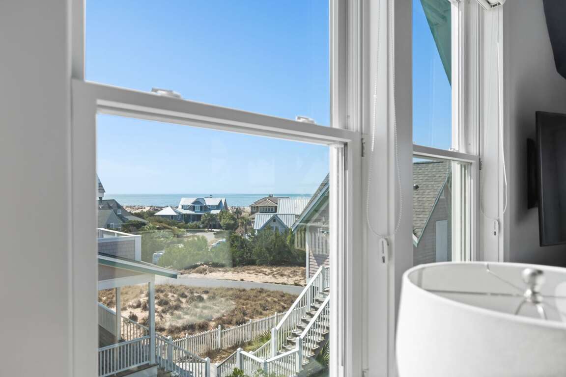 This cozy cottage features two bedrooms and 2.5 bathrooms, situated on the high dunes of Bramble Reach with stunning ocean views overlooking South Beach. On the first floor, you will find a queen guest room with a private bathroom, as well as a master suite featuring a king bed and a spacious bathroom with a separate tub and shower. You can also enjoy the island breeze from the back screened porch, accessible directly from the master bedroom.