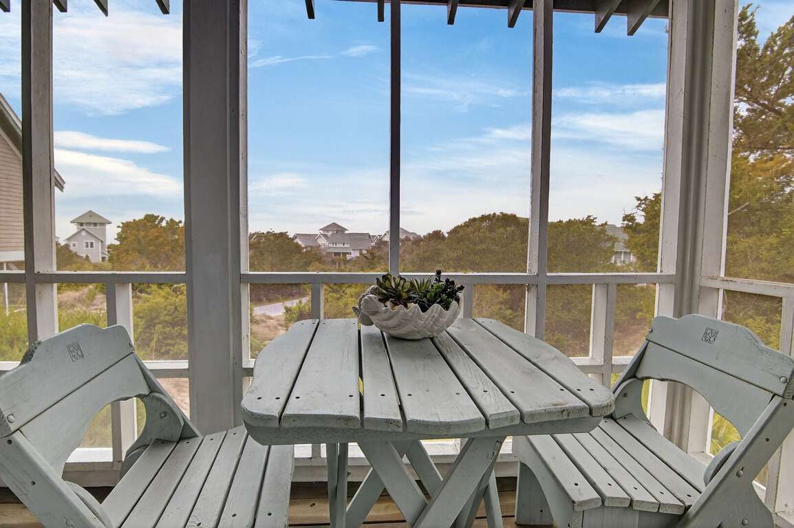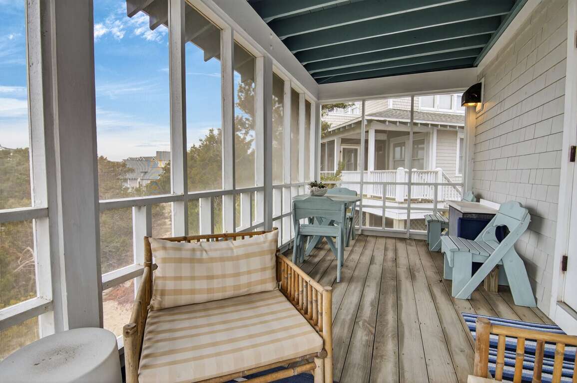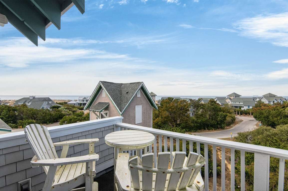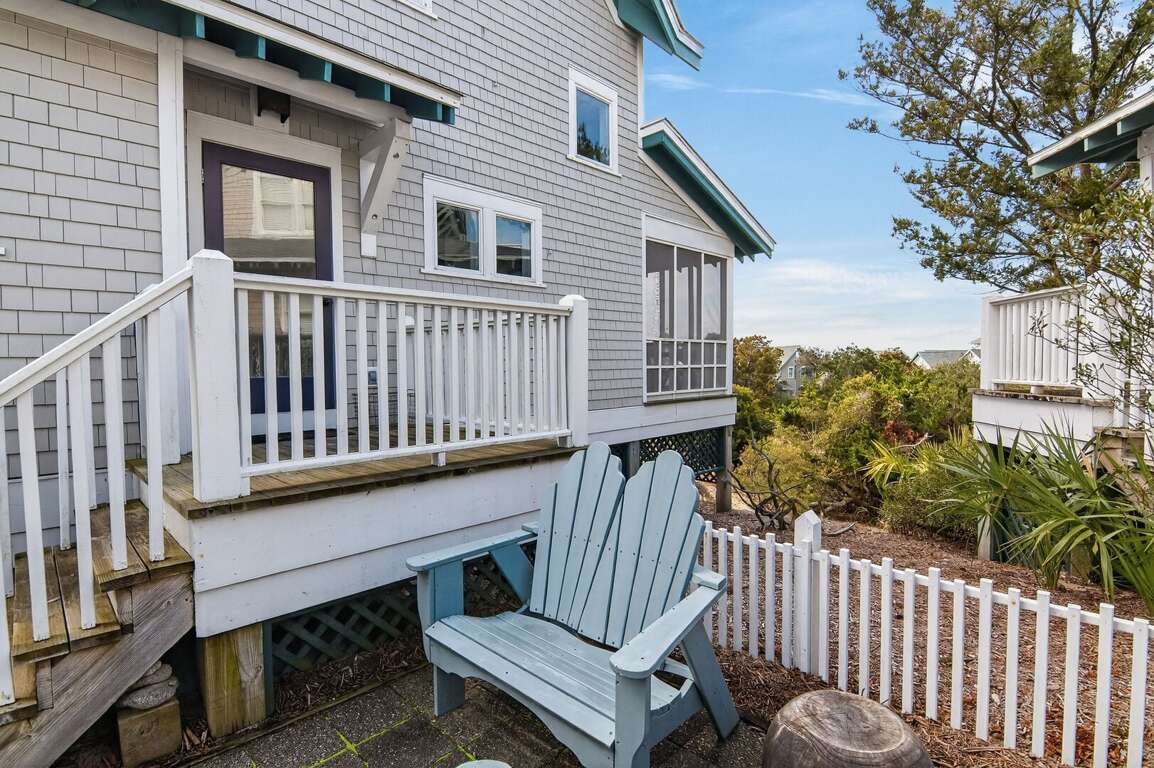 Highland Sunset is a 2-bedroom home on the high dunes of Bramble Reach with ocean views of South Beach in Bald Head Island, NC, a quiet place to stay with open-concept living and a screened porch.