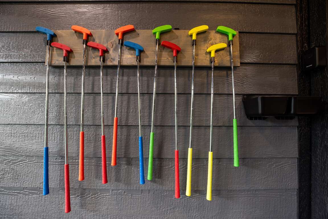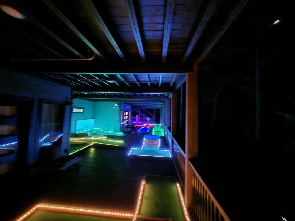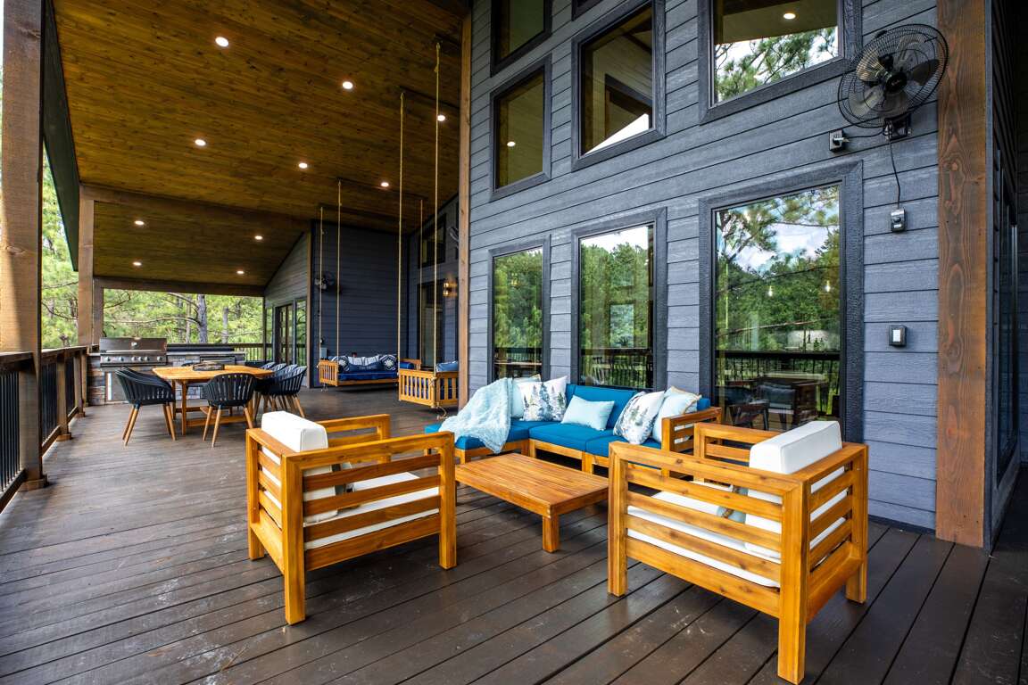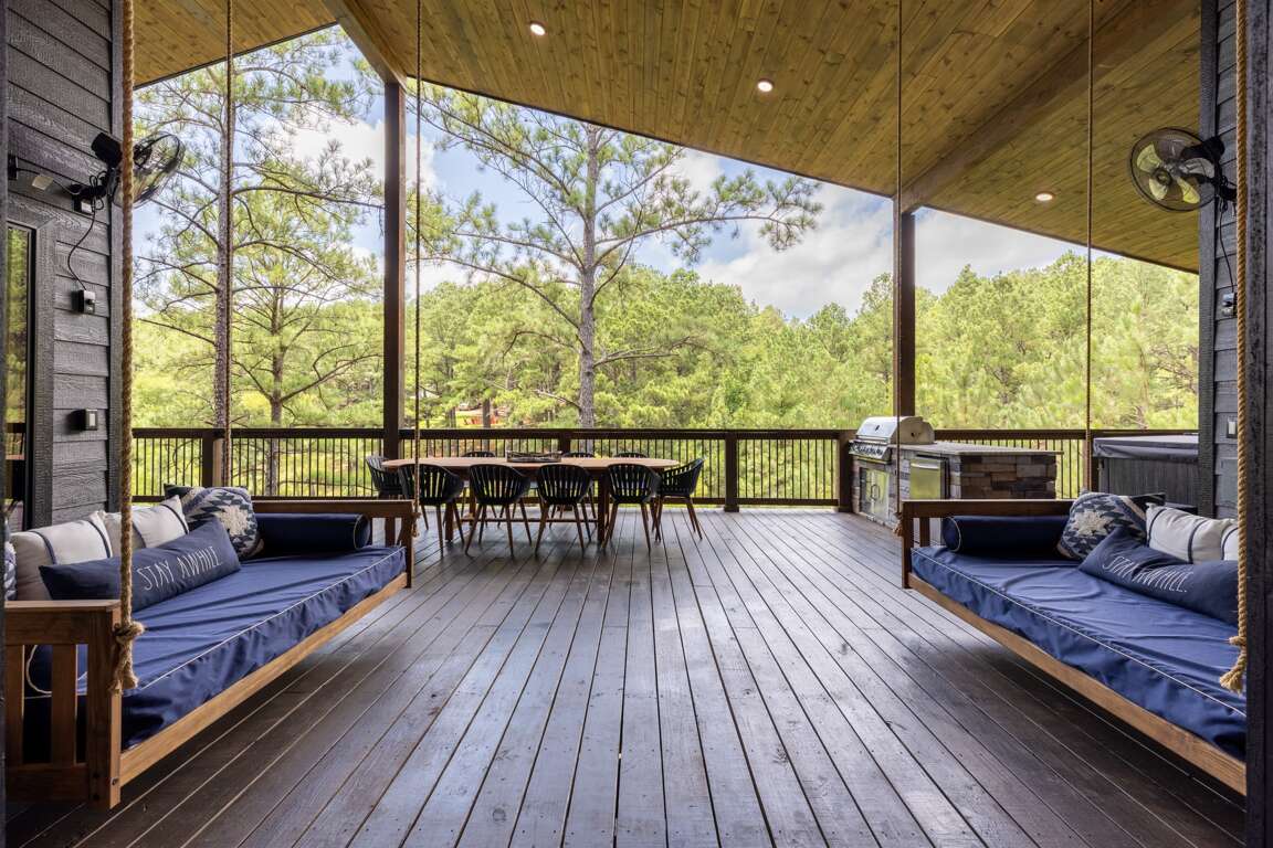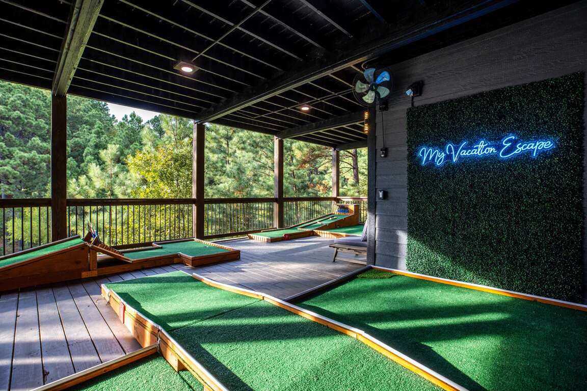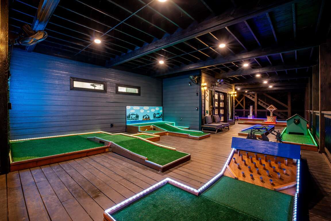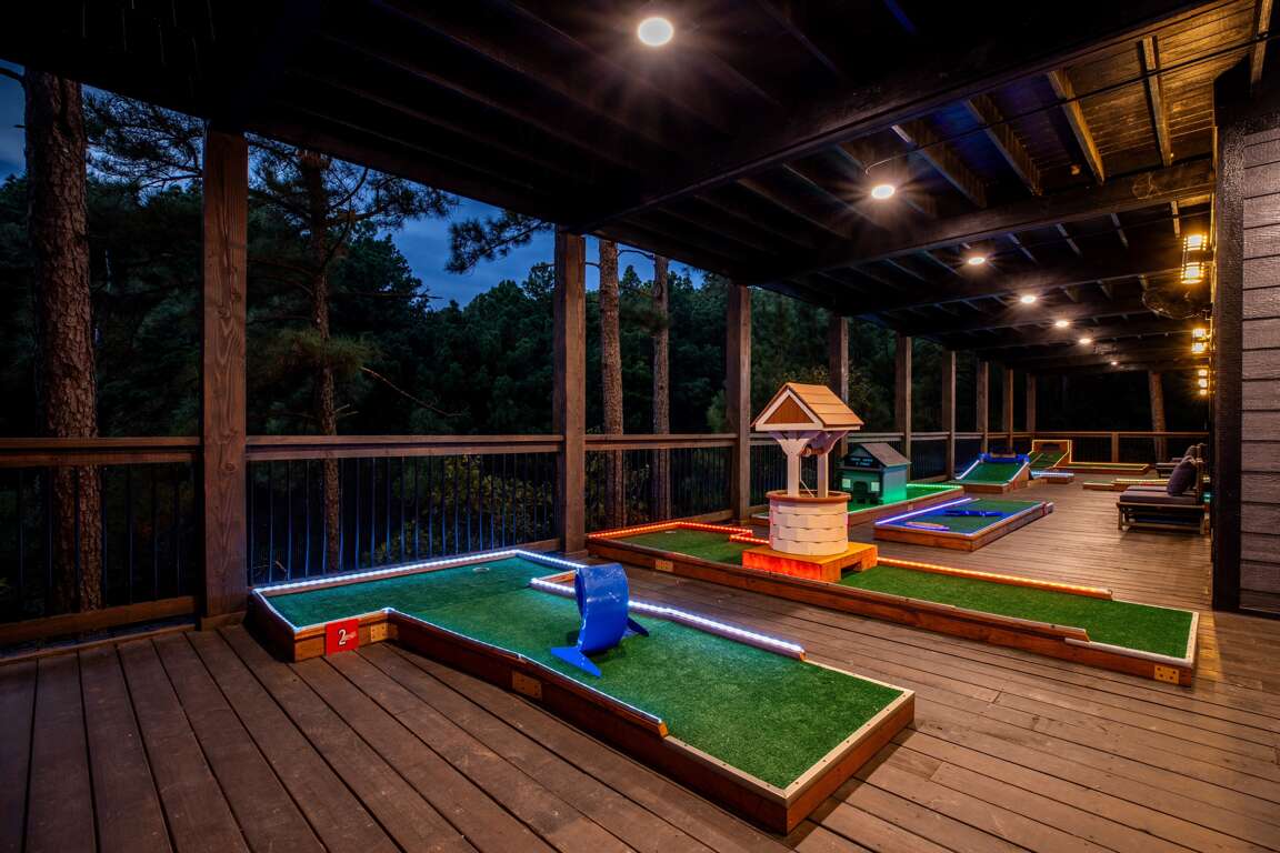 Outside you will find a huge double decker deck (3000 sq. ft.) with a highly elevated views of the beautiful surrounding trees and pond. This deck has plenty of room for everyone! You walk onto the top deck where there are two large sectional sofa areas, large stone fireplace with a 65″ Smart TV, and two custom large porch swings. Plus, an outside dining area seats ten where folks can relax and chill while grilling at the outdoor kitchen. There is also a large hot tub which seats seven people when you’re ready to relax and unwind for the day. If you head down to the lower deck you will find a full 9 course mini golf set with LED lighting for games during the day or night. The entire deck is completely covered providing full shade and allowing you to enjoy the outdoors even on a rainy day.