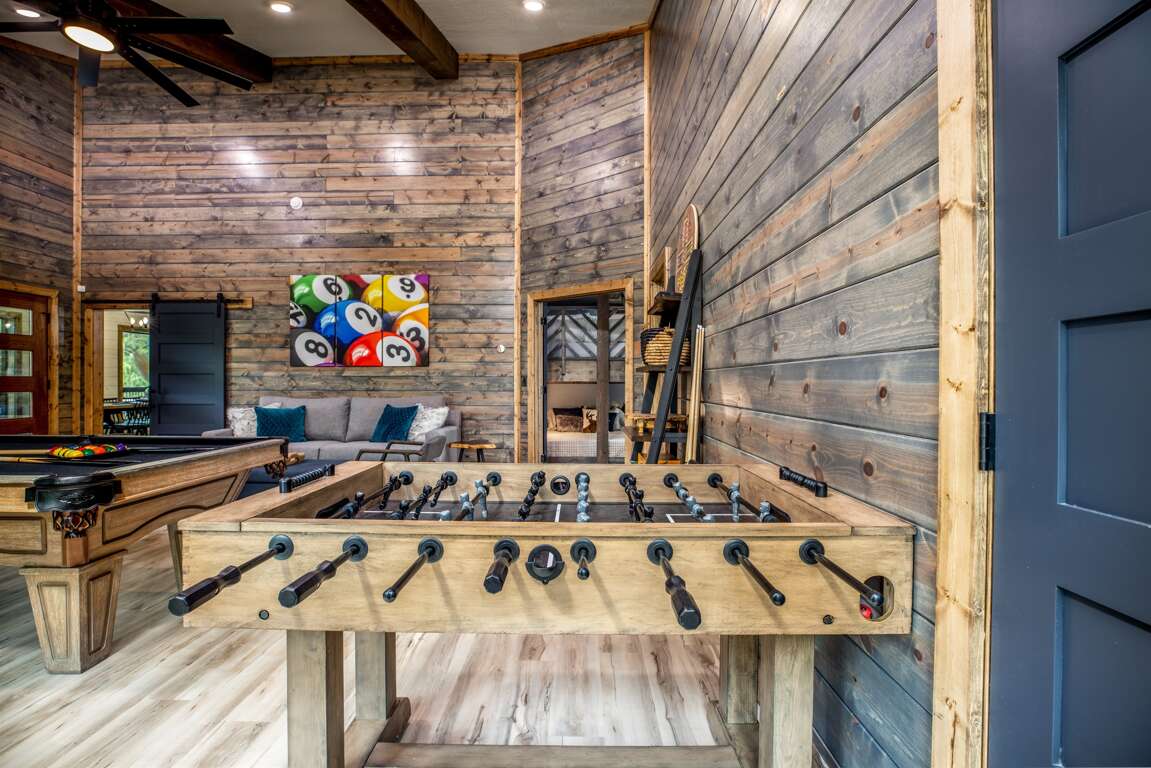 This cabin is loaded with amenities for everyone! With a pool table, foosball, shuffleboard, ping pong, 9 holes of mini golf, cornhole, games, swings around the fire pit, and fishing at the pond.