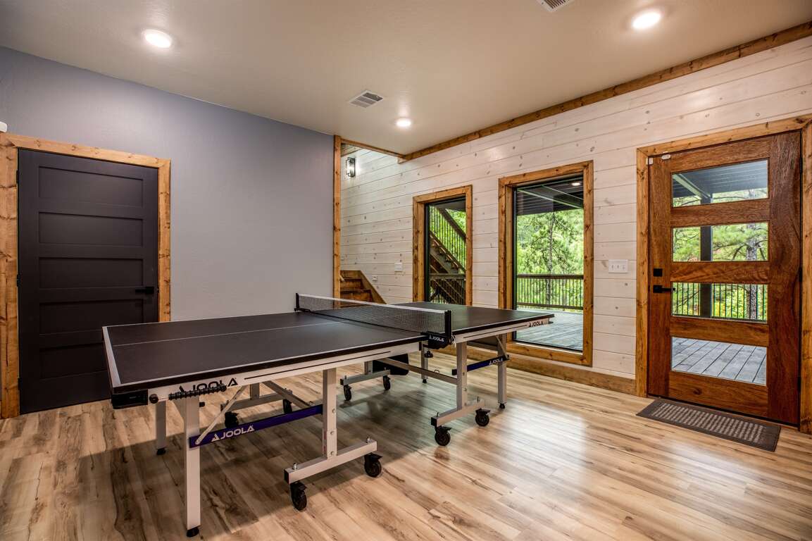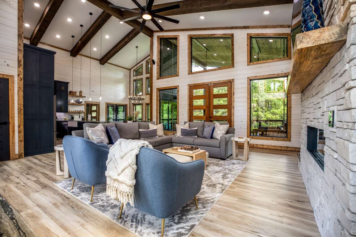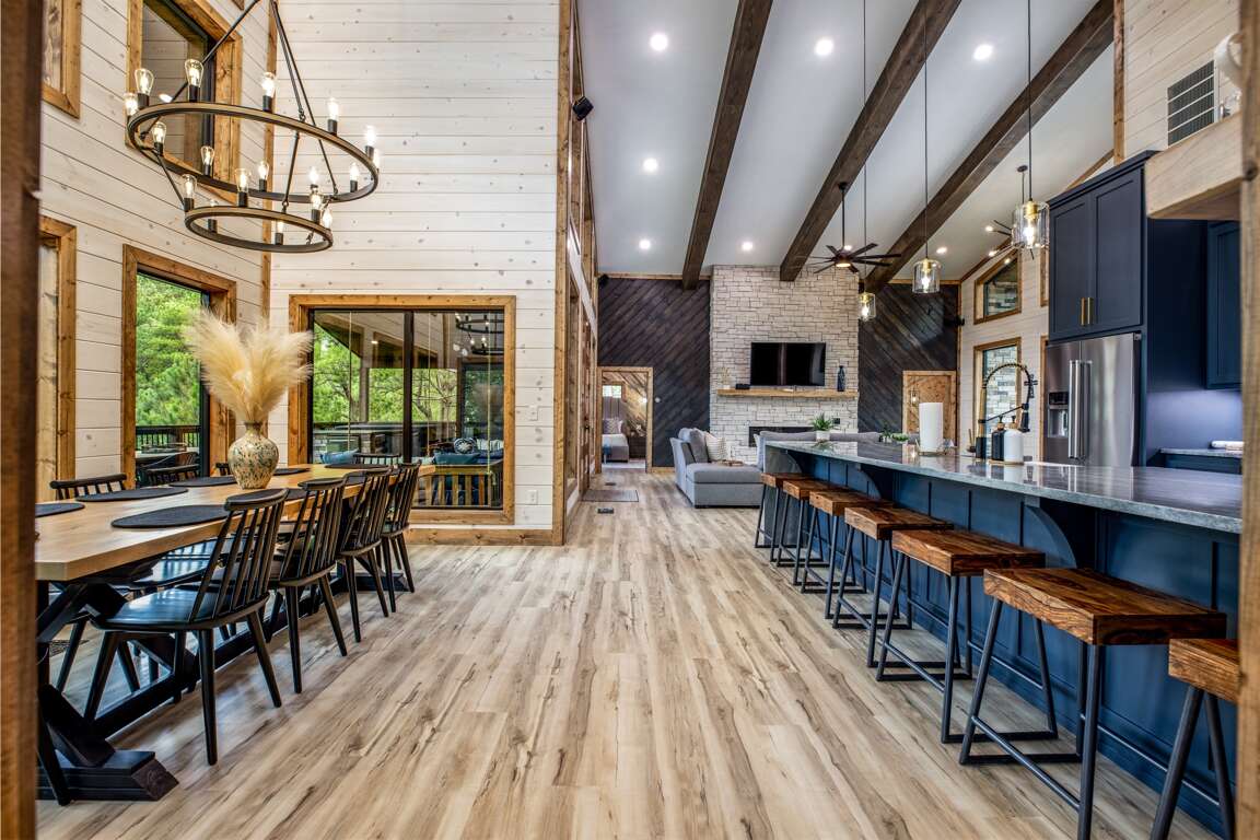 Enjoy upscale furnishings, high-end finishes, and plenty of activities for everyone. The living room and kitchen are an open concept, so it is perfect for groups that want plenty of space. There is a beautiful rock fireplace in the living room and a large 65” Smart TV equipped with full surround sound. Enjoy Hulu TV or choose to stream a movie from your account (Netflix, Hulu, YouTube, etc.) while relaxing on the sectional sofa or comfortable chairs.