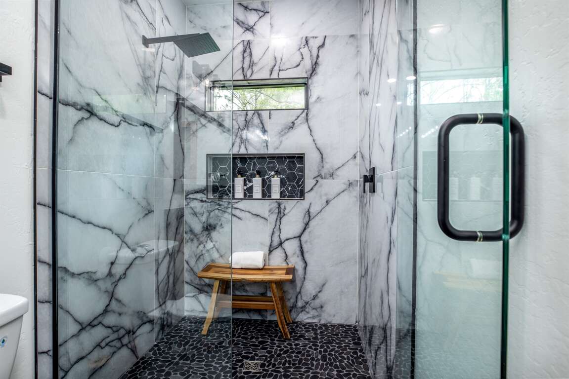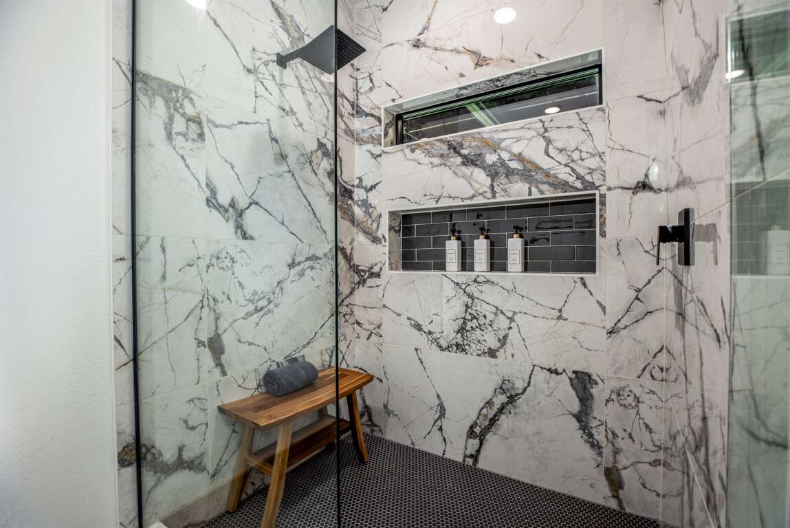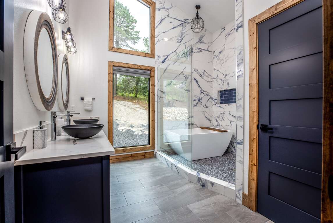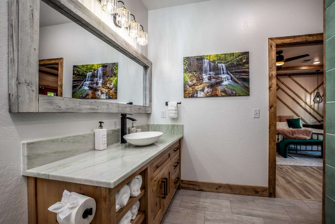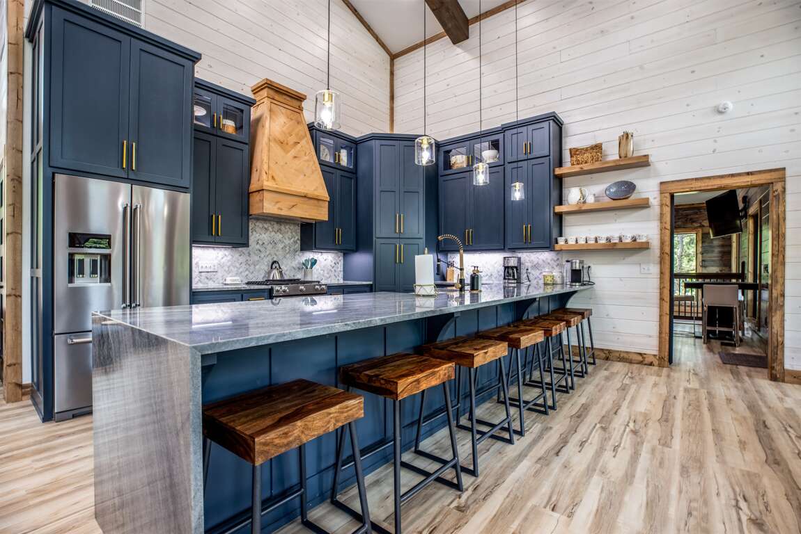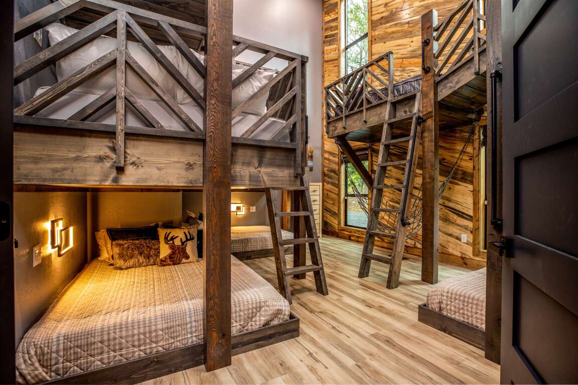 This cabin features four king master suites with two on the main floor and two downstairs. Each master suite is beautifully decorated with an accent wall for the bed and comes with its own 55″ Samsung Smart TV. Each of these gorgeous suites have their own private bath with vessel vanity sinks and stunning large tile showers. The bunk room is a kids (or big kids!) dream with ten custom bunk beds, large hammock to relax in, en suite bath with double vanities and a luxurious wet room.
