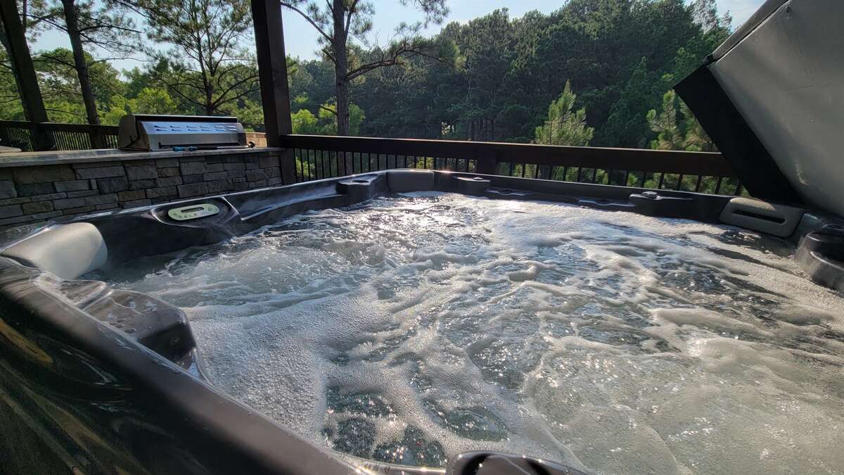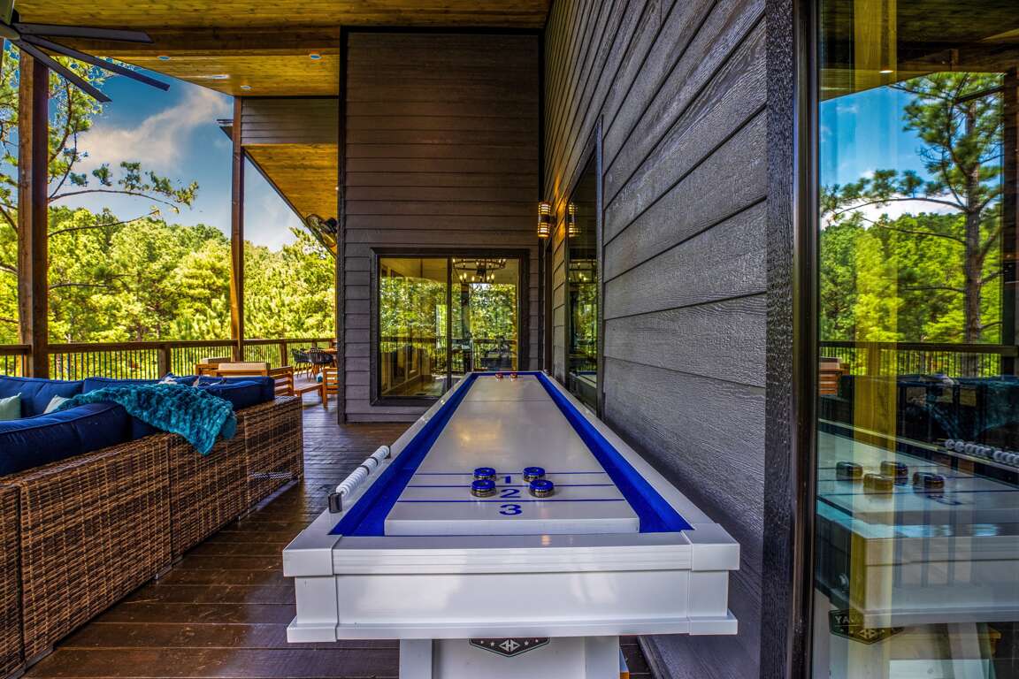Experience the highly elevated view from the two large decks surrounded by trees overlooking the water. On the top deck you will enjoy the hot tub, large porch swings, multiple seating areas, outdoor kitchen, fireplace, outdoor TV area Cornhole and shuffleboard. On the bottom deck you can challenge family or friends to game of mini golf on our 9 hole course. Never worry about rain outs with because both decks are completely covered at this spectacular cabin. This cabin is also conveniently located near Hochatown where you will find all favorite attractions and restaurants.