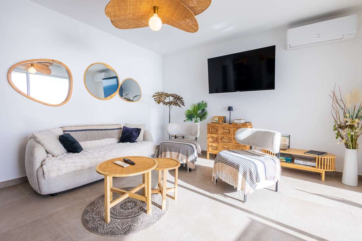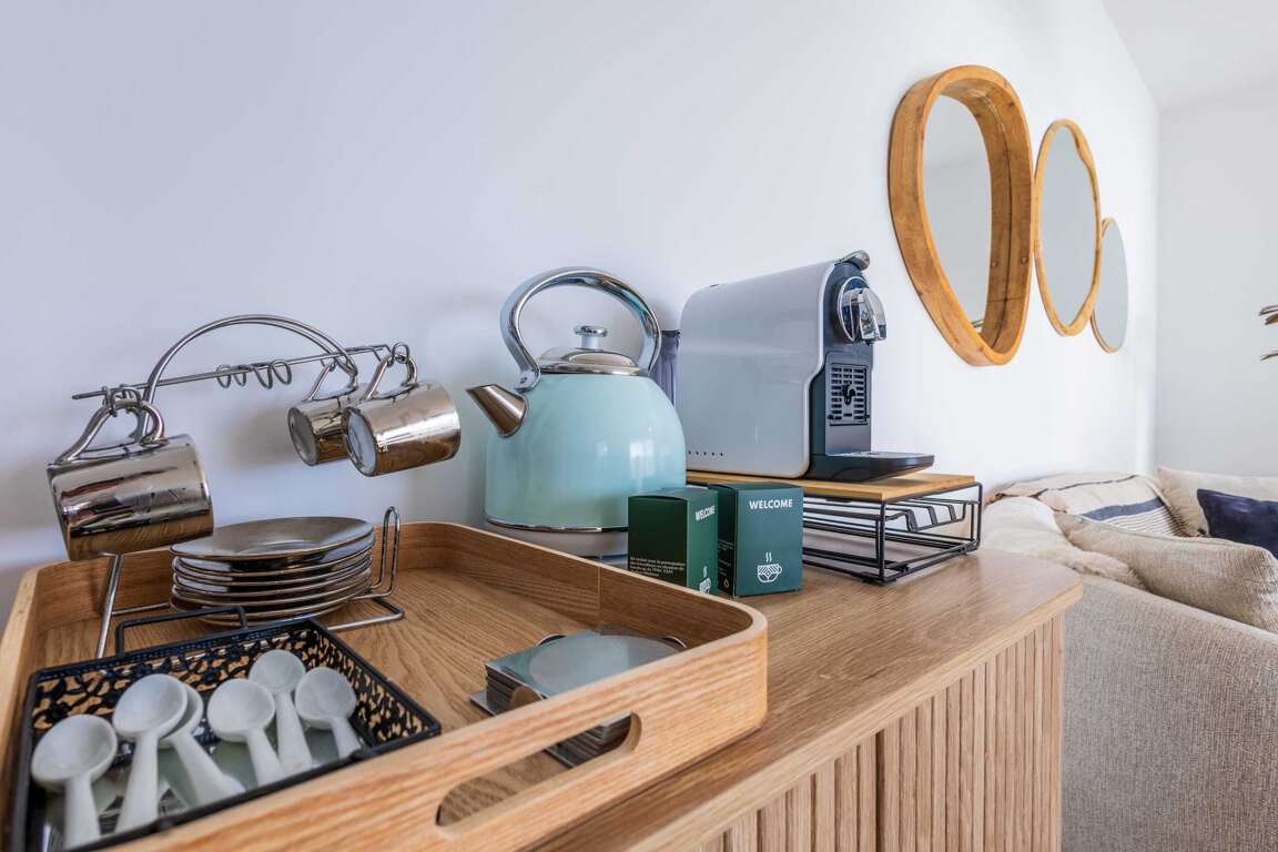 • Fully equipped open-plan kitchen: induction hob – refrigerator – microwave – oven – freezer – dishwasher – coffee maker – toaster – kettle – dishes and cookware