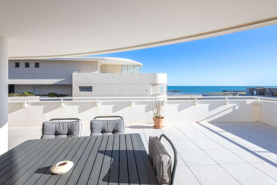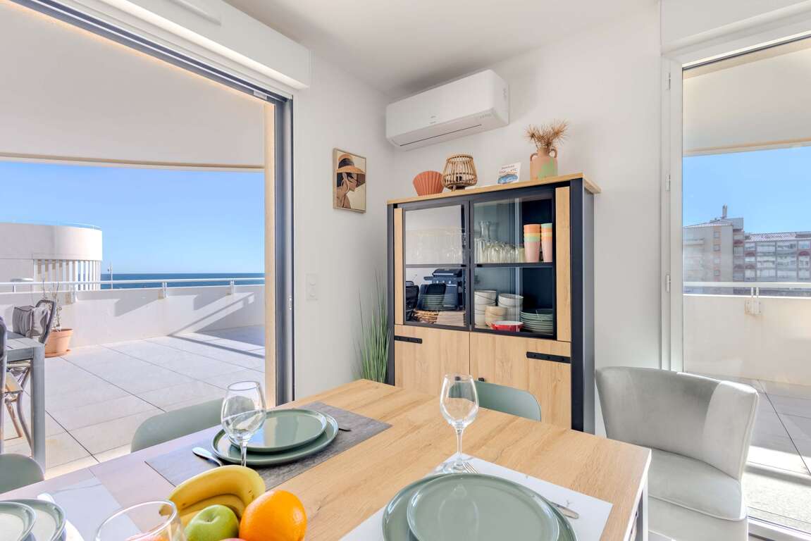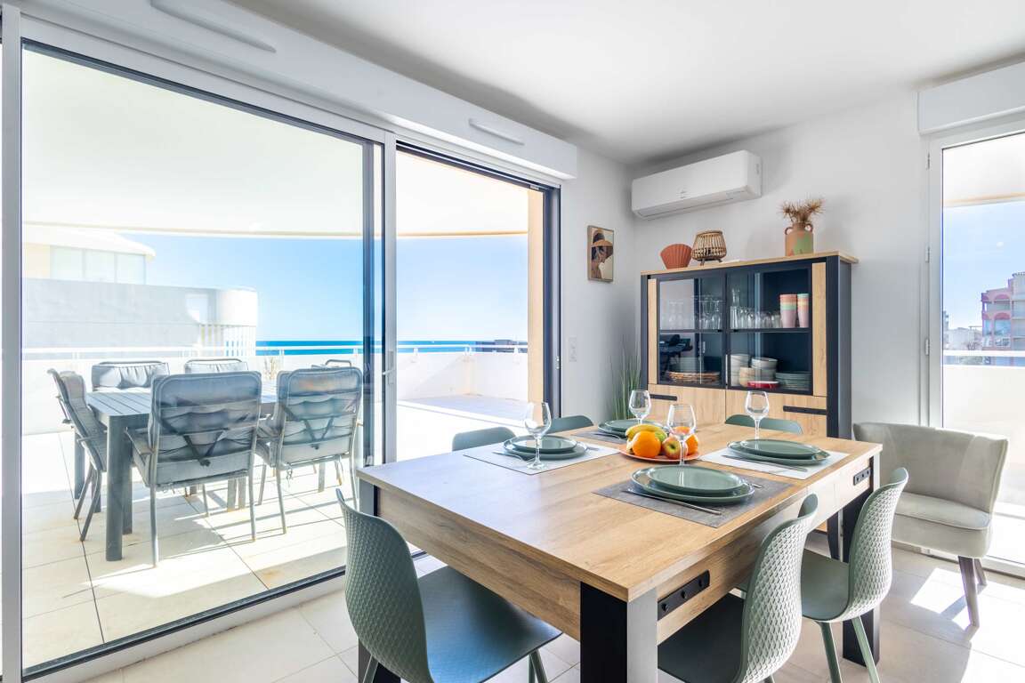 Beachfront apartment in Valras-Plage, FR, a practical vacation rental with 2 bedrooms, sofa bed, full kitchen, air conditioning, elevator, and garage parking.