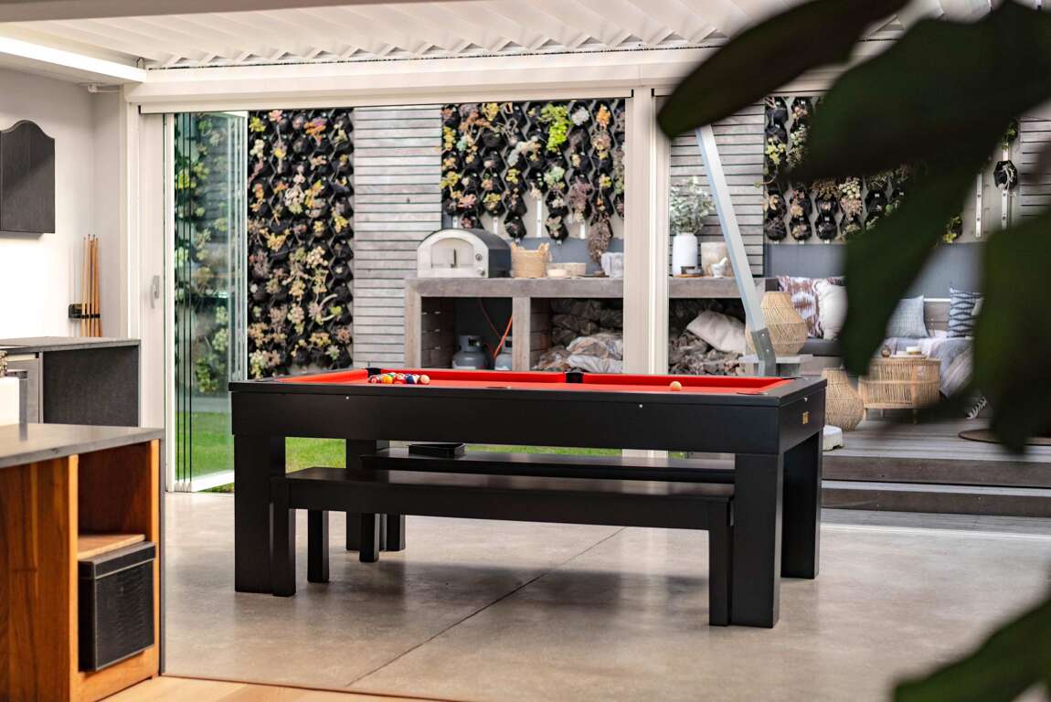 • Top level: bar and entertainment area with pool table, panoramic terrace featuring a designer fire pit and bespoke 16-seater concrete dining table