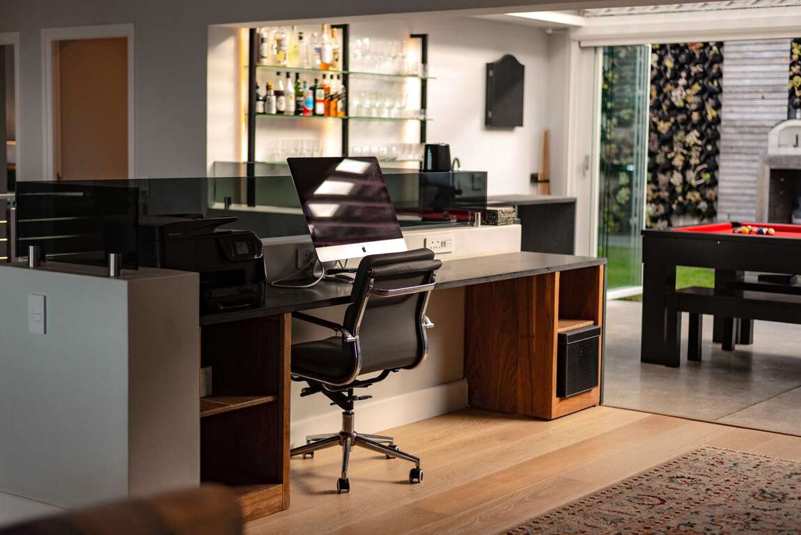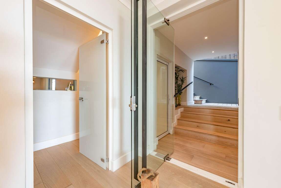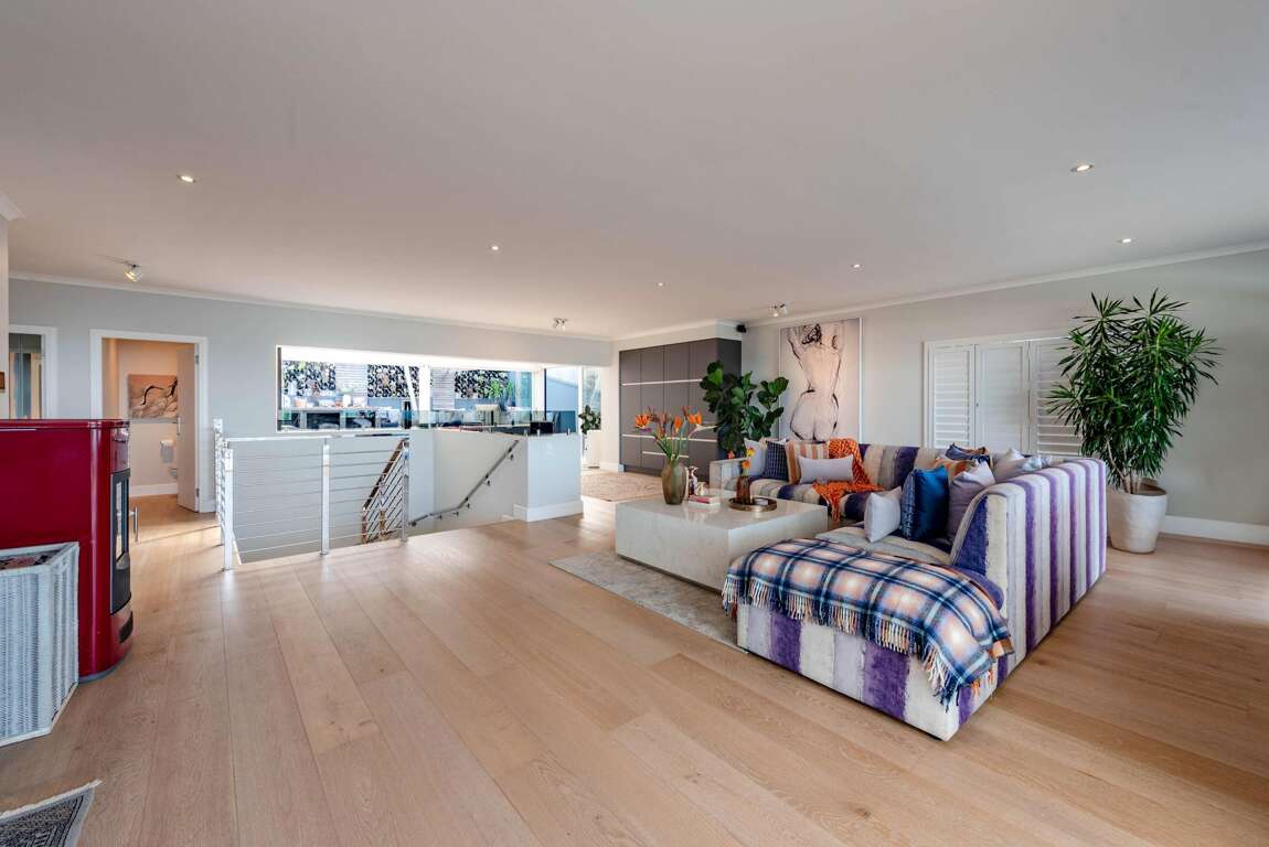 • Middle level: expansive open-plan living area with German designer kitchen featuring an AGA stove, top-of-the-line appliances, dining area and lounge with Italian pellet fireplace and engineered wood flooring