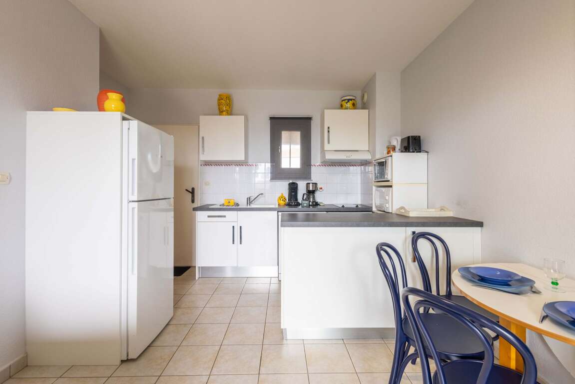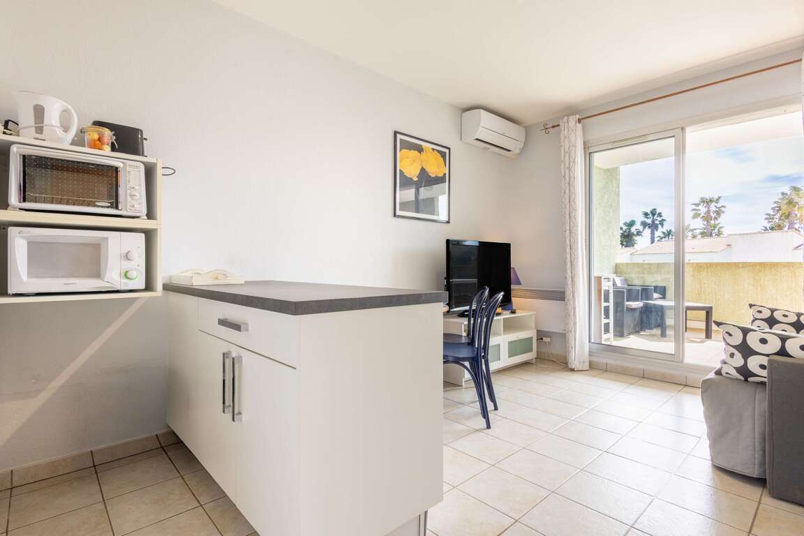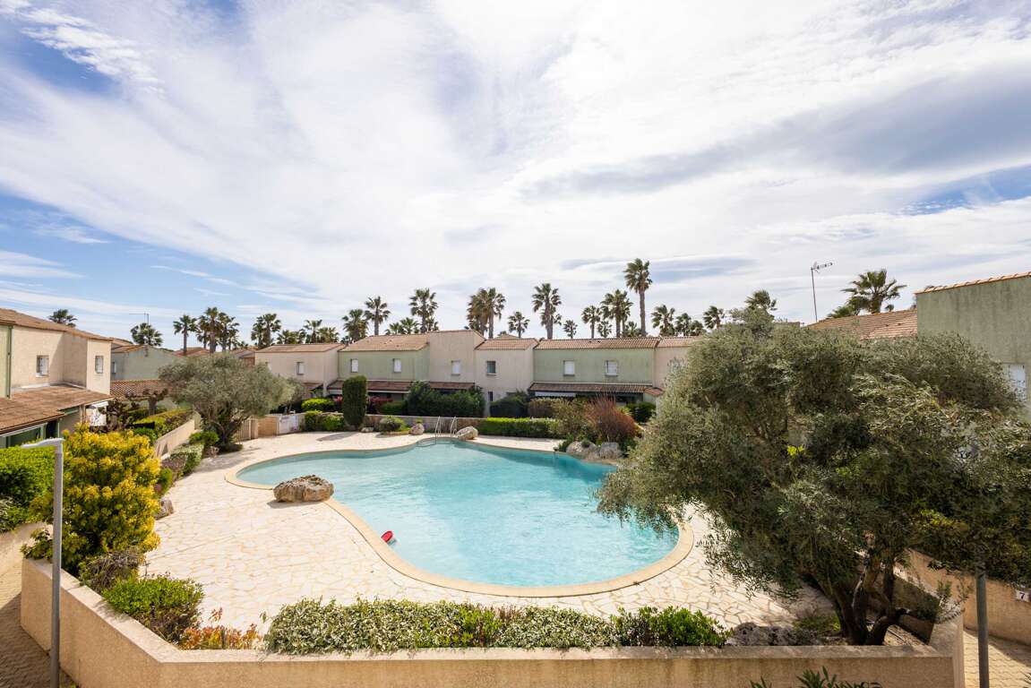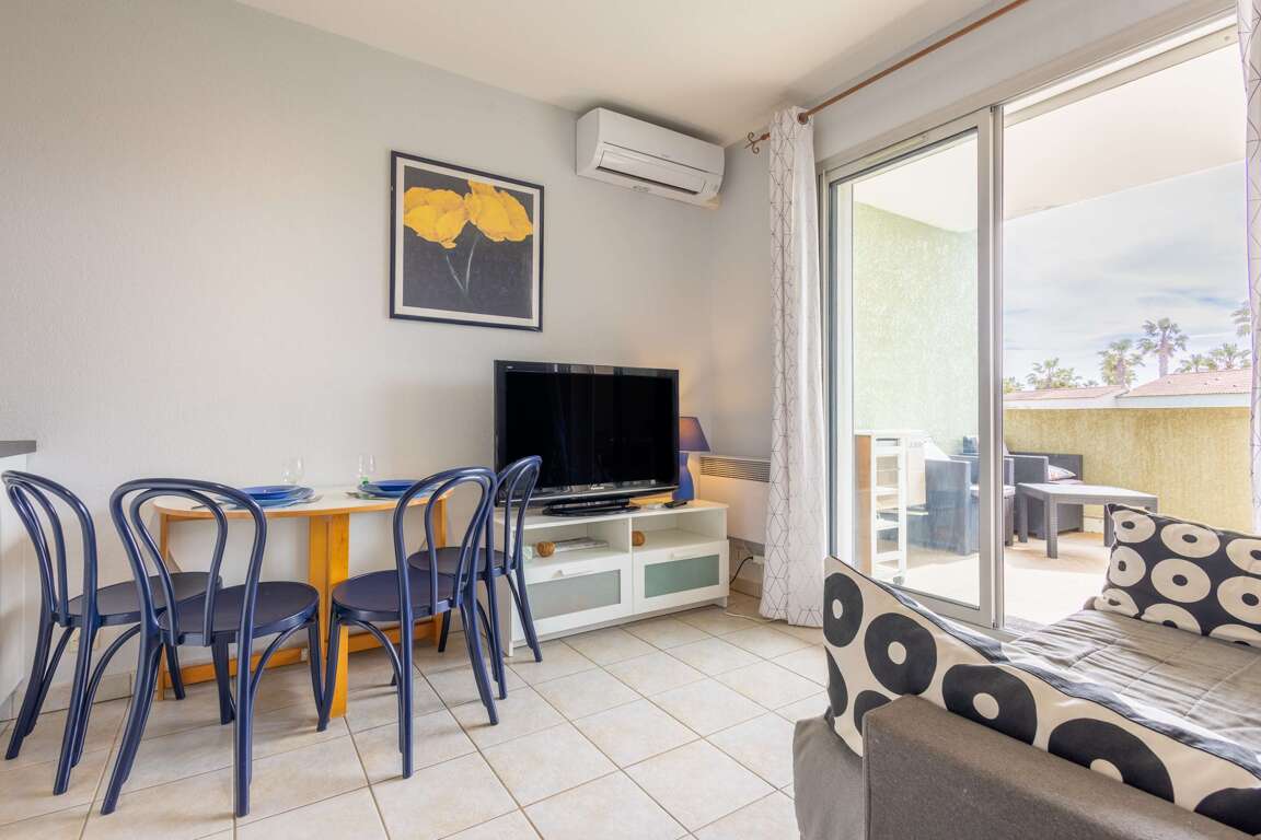 Modern 35 m² apartment vacation rental in Valras-Plage with a furnished loggia facing the pool, air conditioning, Wi-Fi, and two bicycles, sleeps 4.
