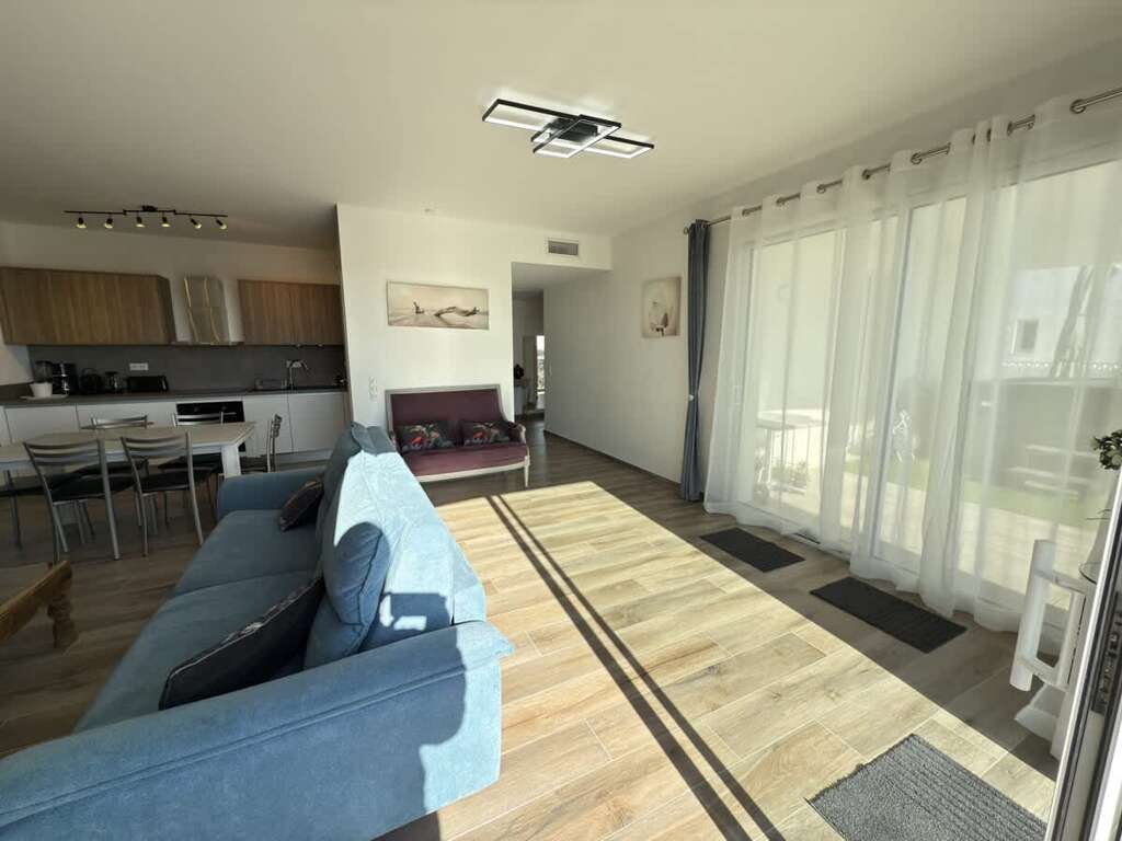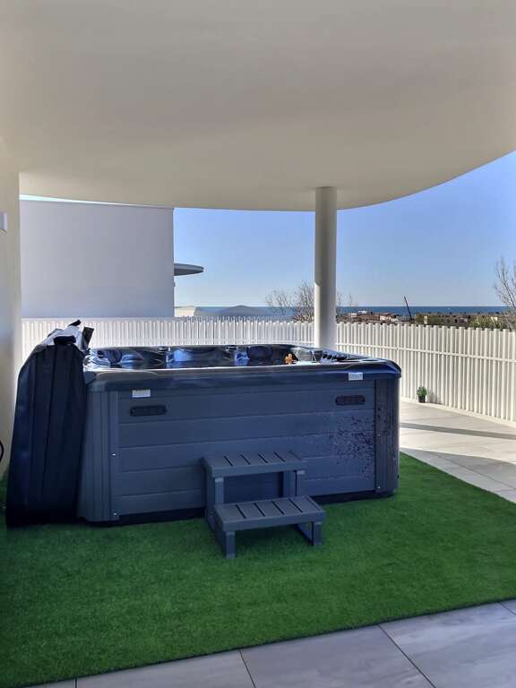Apartment vacation rental in Valras-Plage with 3 bedrooms, 2 baths, private jacuzzi, balcony, and seasonal shared pool, plus beach access 500 m away.