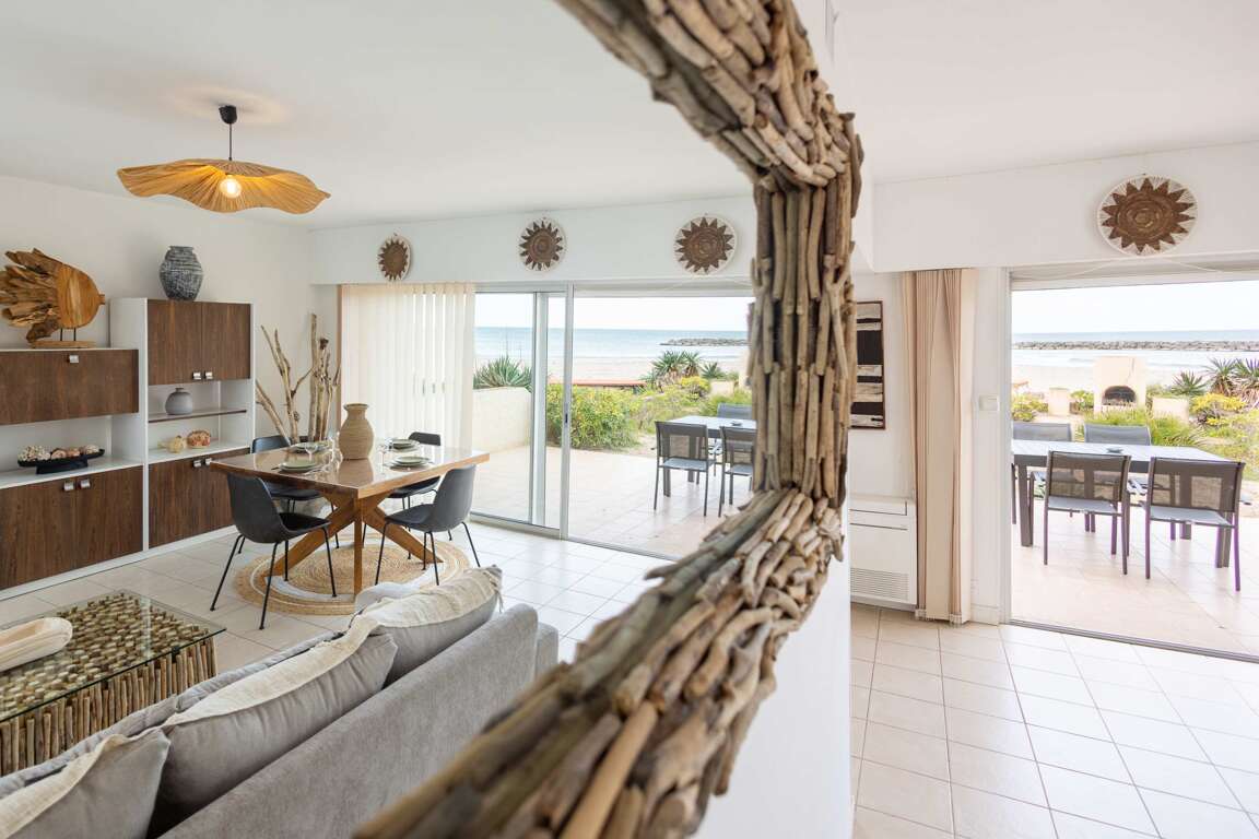 Villa vacation rental in Valras-Plage with direct beach access from a private garden, sea-view living room, shaded patio, and space for up to 7 guests.