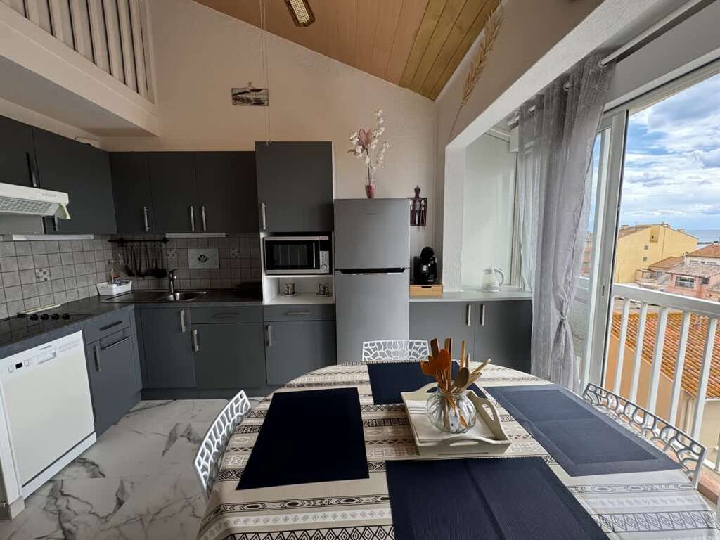 Fifth-floor apartment vacation rental in Valras-Plage with sea views, a double bedroom plus sofa bed, and a kitchen, close to the port and beach.