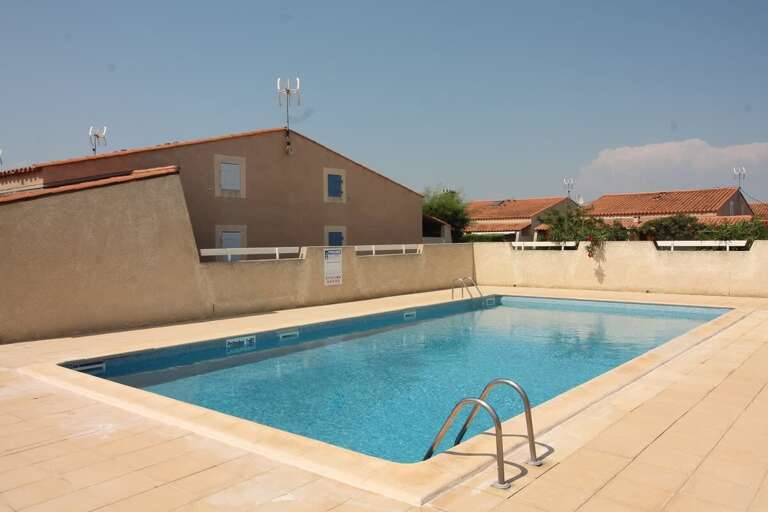 Villa vacation rental in Valras-Plage with a shared pool, private terrace, and mezzanine sleeping area, close to beaches, shops, and restaurants.