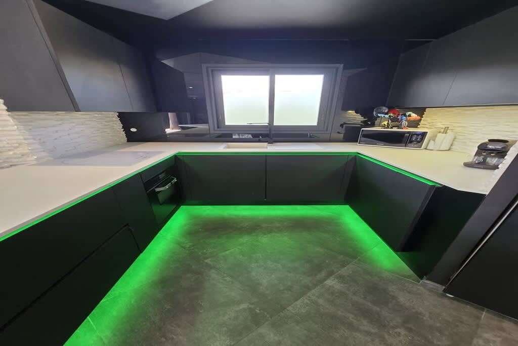 Fully equipped open kitchen: oven, microwave, dishwasher, induction hob, coffee maker, kettle, toaster…