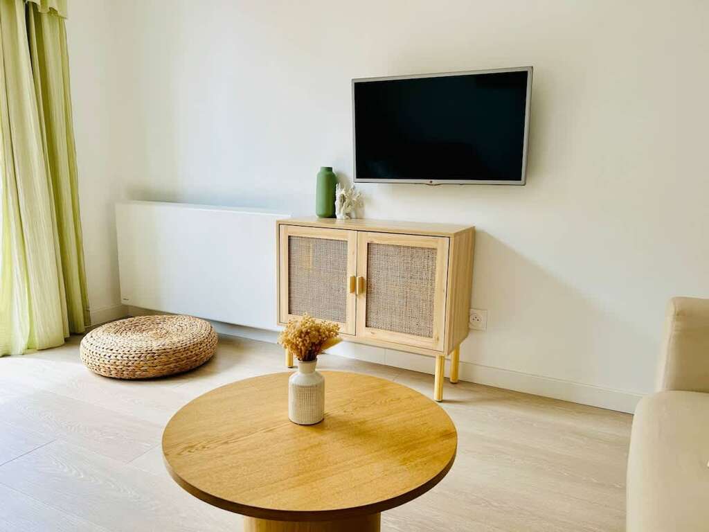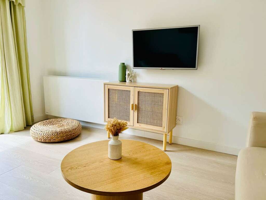 • Bright living room with sofa and flat-screen TV