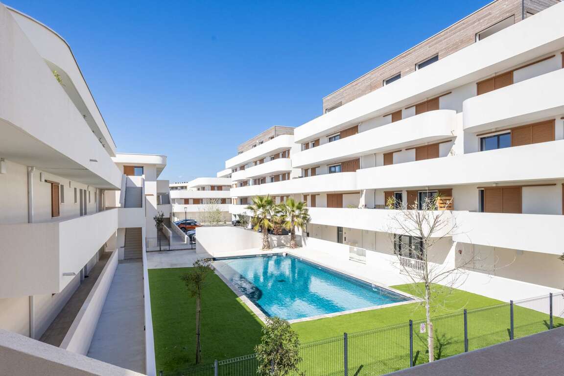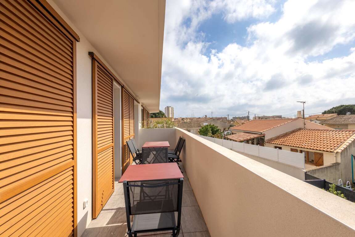 Air-conditioned apartment in Sérignan with a furnished terrace, Wi‑Fi, and summer pool access, a practical vacation rental near Valras-Plage beaches.