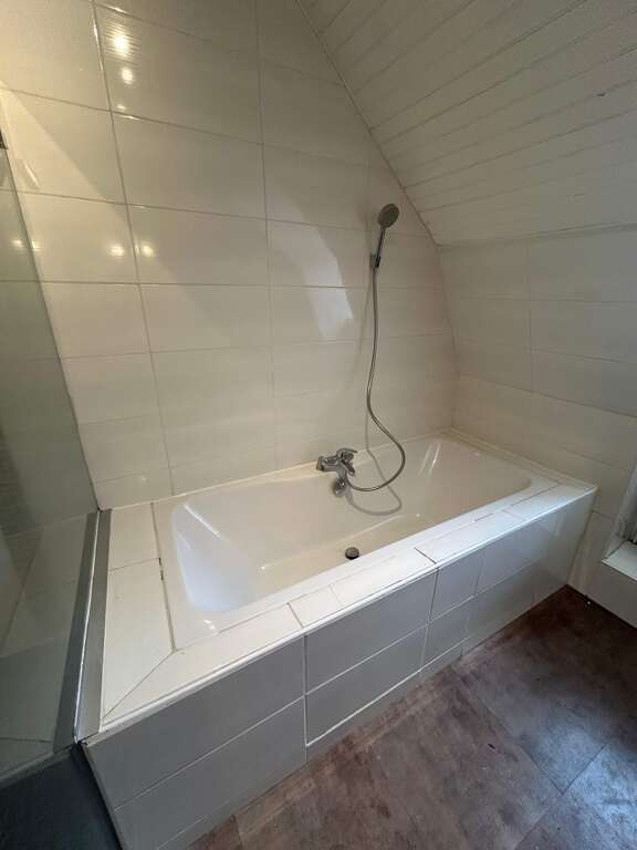 Large bathroom with bathtub and shower
