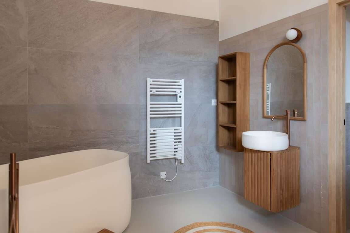 Independent 35 m² house-style suite in Magalas with a sitting area, 1 bedroom area, and bath with tub plus separate WC, set in a renovated outbuilding.